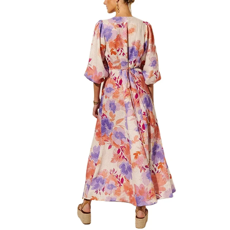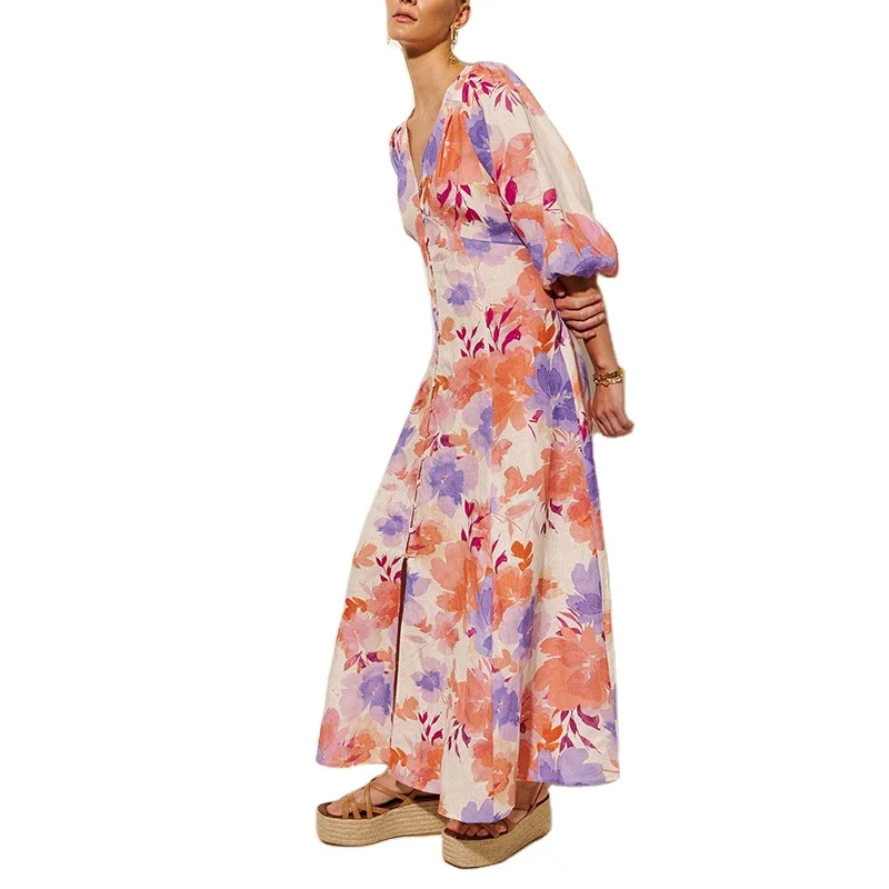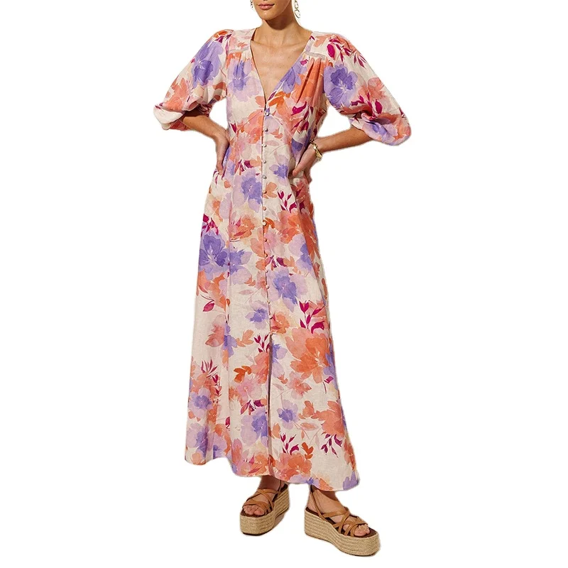 Custom High Quality Spring Summer ManufacturersShort Sleeve Women Design Front Button Linen Loose Casual Print Midi Dresses