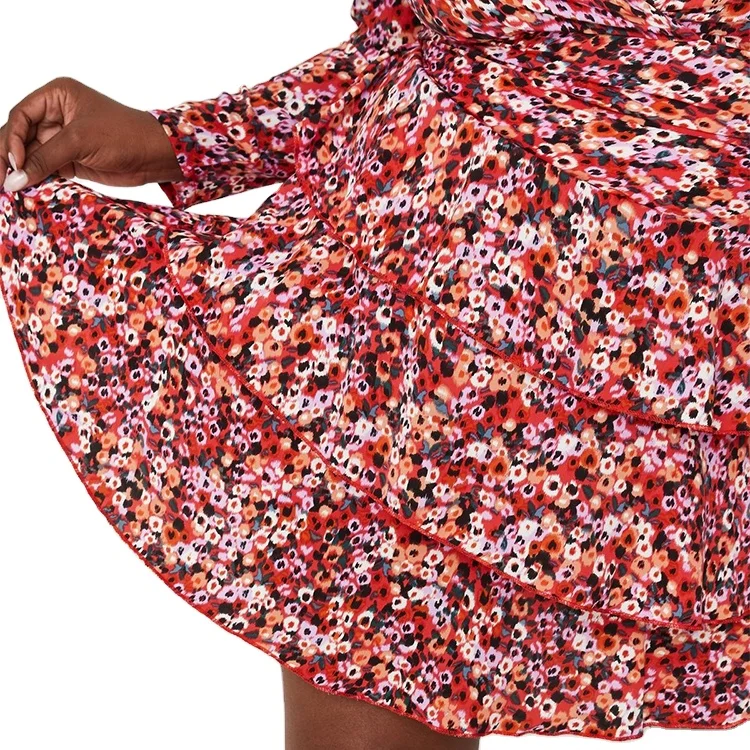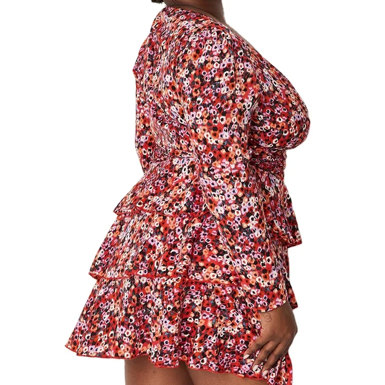 Custom High Quality Spring Summer Ladies Dress Ruffle Wrap Long Sleeve Women Plus Size Floral Print Dress