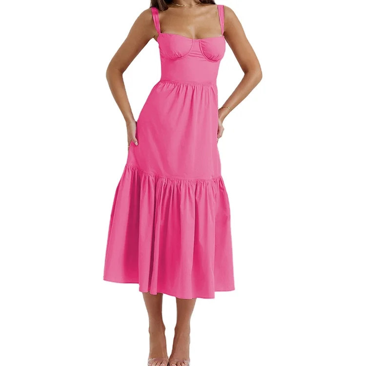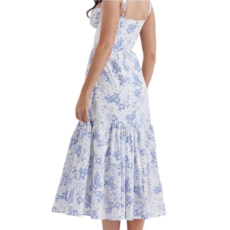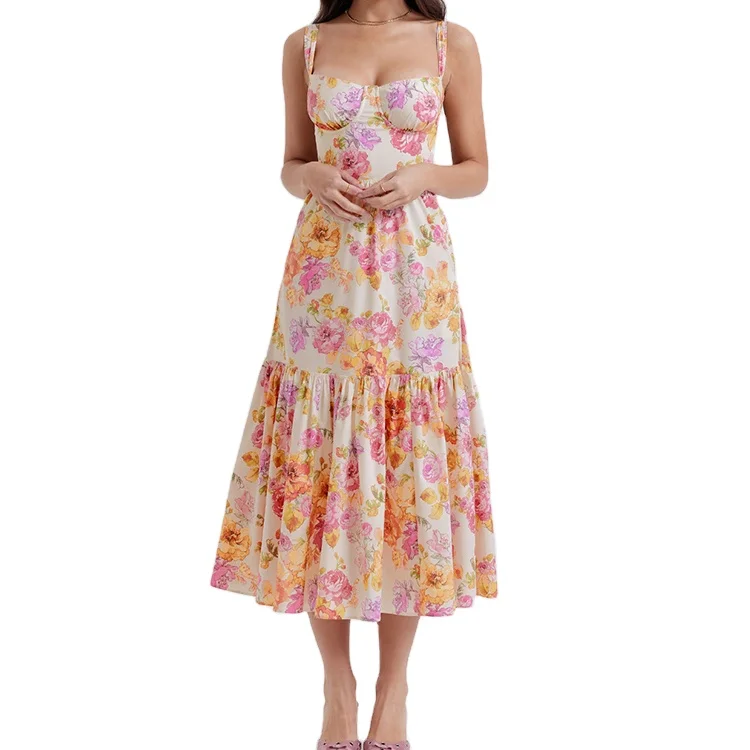 Custom High Quality Spring Summer Sleeveless Casual ELEGANT Midi Floral Print Pattern Square Neck Natural Waist Dress