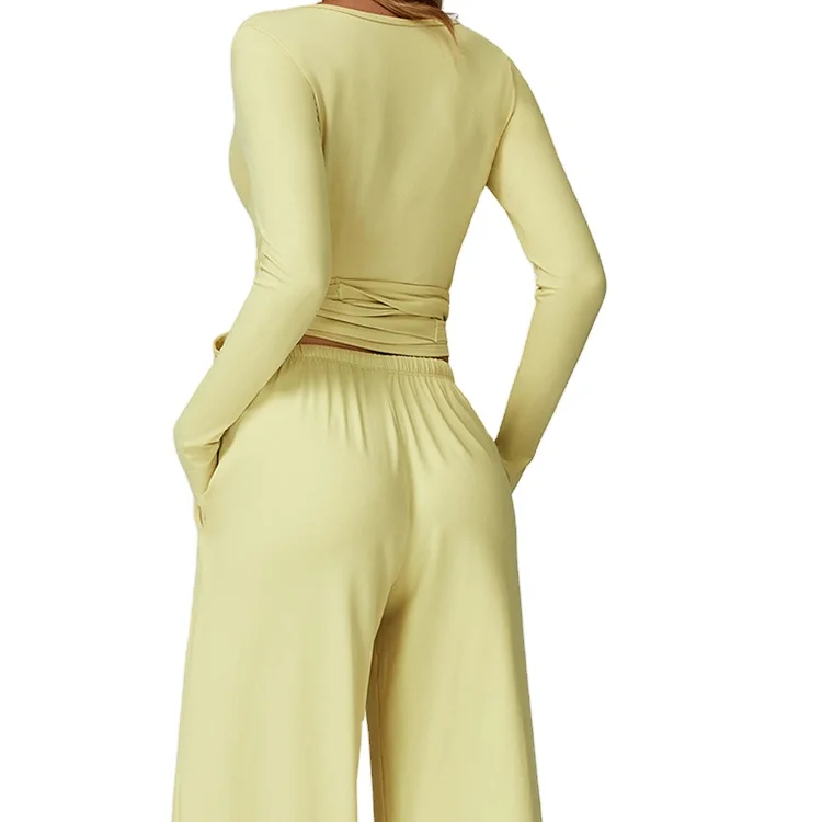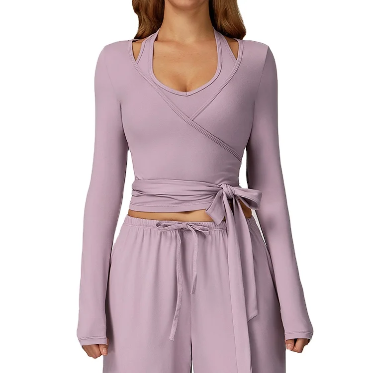 LANGHE Custom High Quality Quick Dry Long Sleeve Deep V-neck Yoga Top One-piece Wrap Running Sports Top for Women