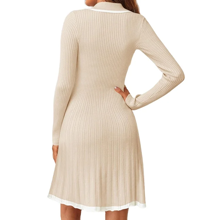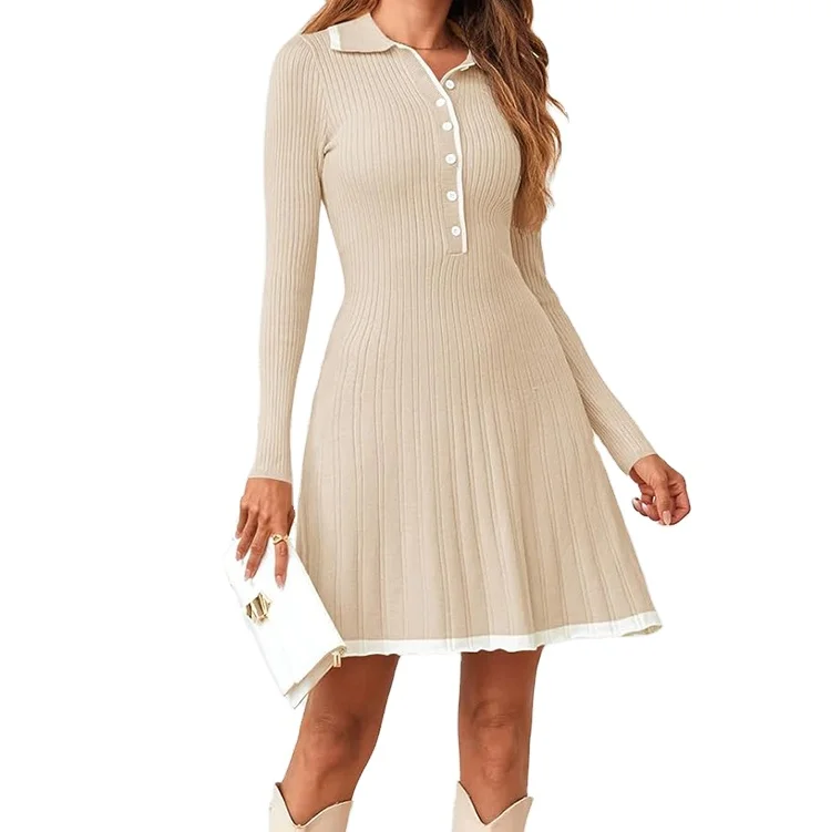 Custom High Quality Women's Casual Simple A-Line V Neck Sweater Dress Long Sleeve Button Mini Work Viscose Natural Waist