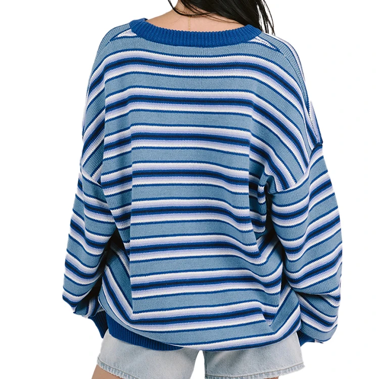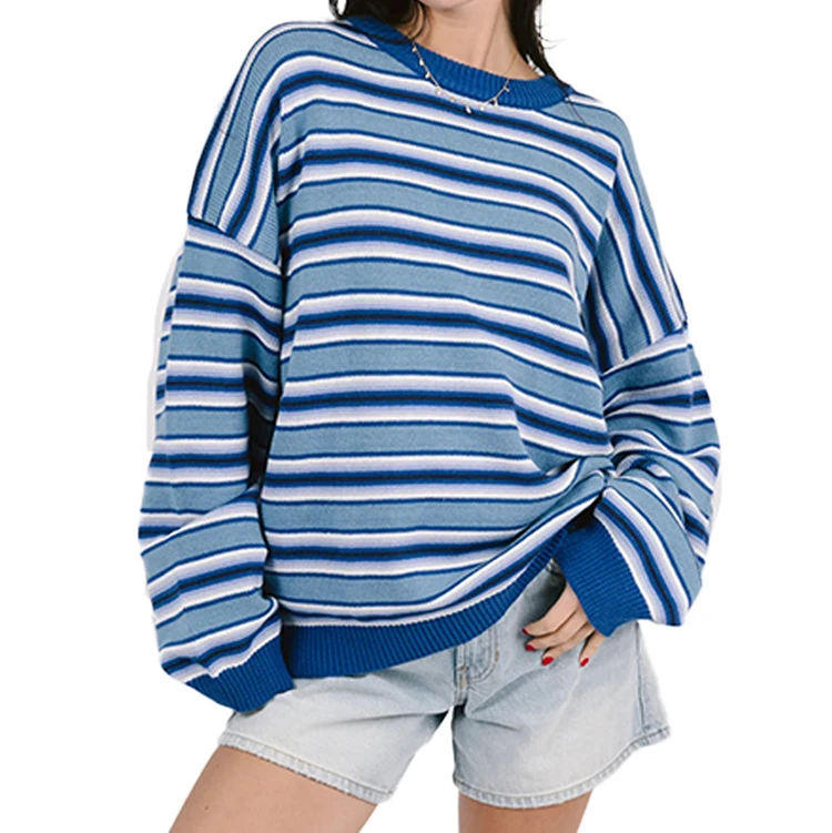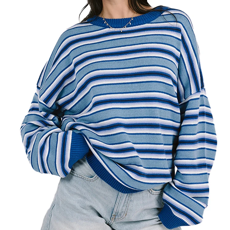 Custom High Quality Spring Autumn Women's Oversized Crew Neck Multi Striped Knit Urban Street Style Relaxed Casual Look
