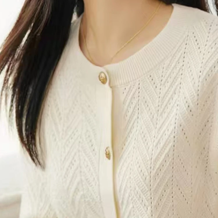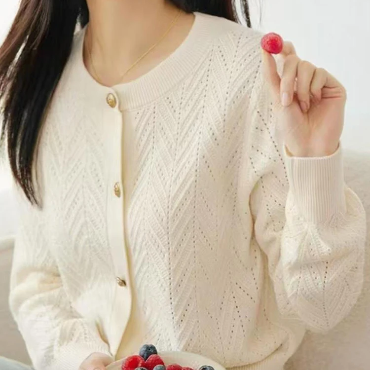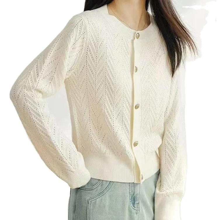 Custom High Quality Spring Autumn Soft Long-Sleeved Thin Knitted Cardigan with Button Pointelle Geometric Pattern Casual Style