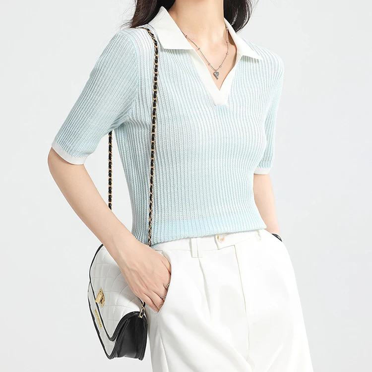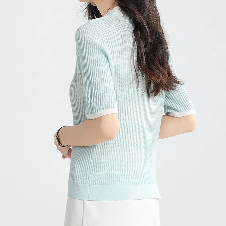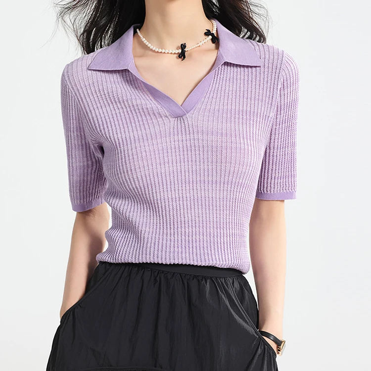 Custom High Quality Spring Autumn Short Sleeve Casual Loose Knit Top Spring Thin POLO V-Neck Cold T-Shirt Women's Knitwear