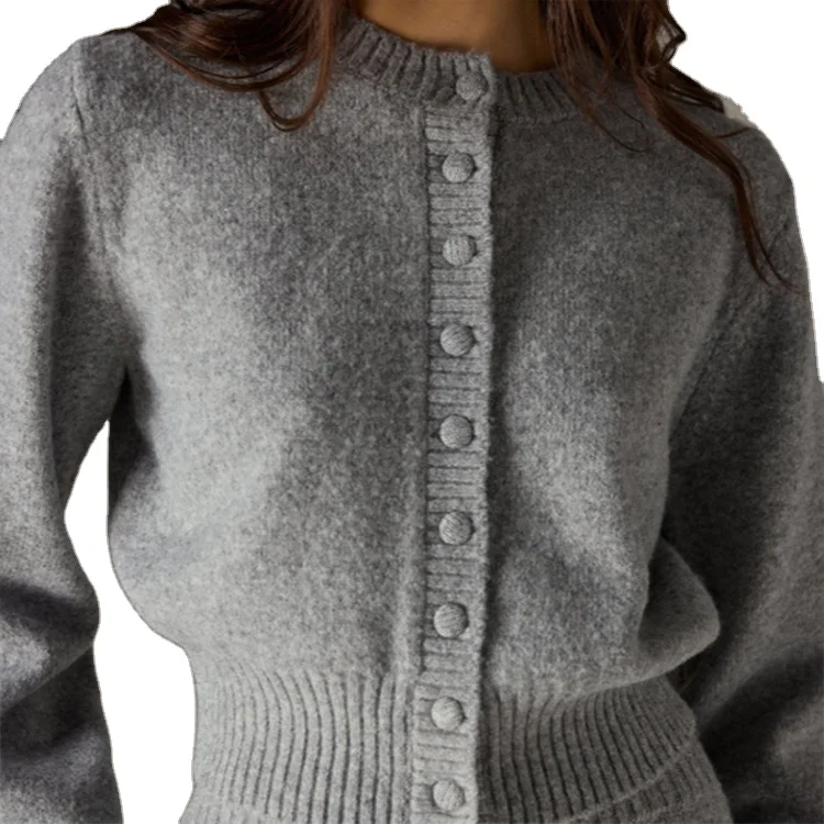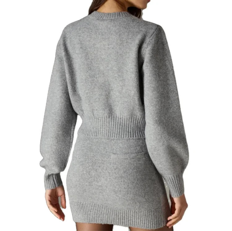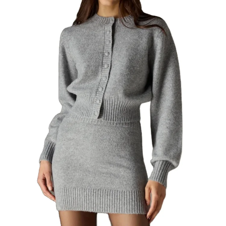 Custom High Quality Sweater Crew Neck Long Sleeves Deep Ribbed Knitted Collar Cardigan Skirts Set Button Front Fastening