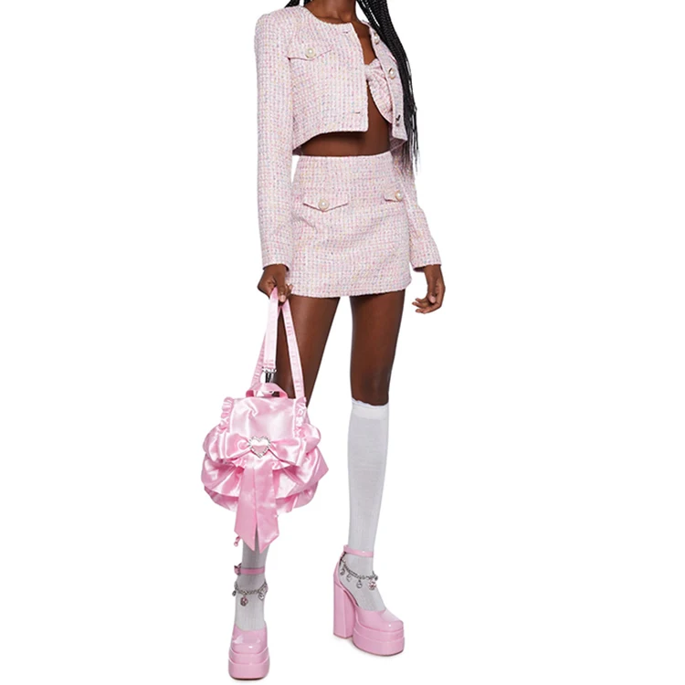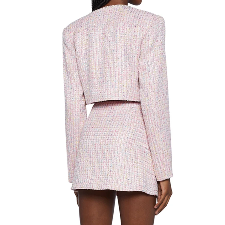 Custom High Quality Luxury Pearl Button Detail Metallic Tweed Set Crop Jacket and a Line Mini Skirt Women's Two Pieces Set
