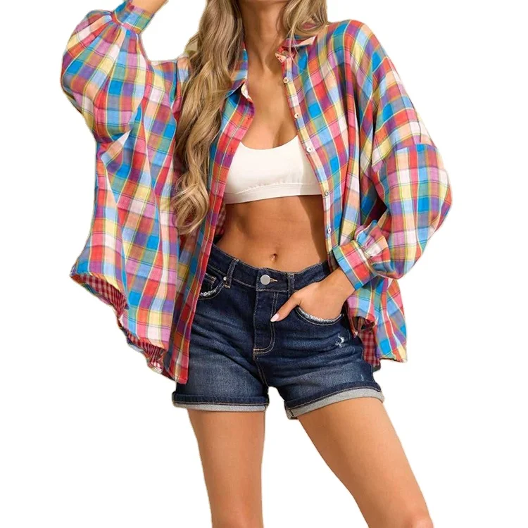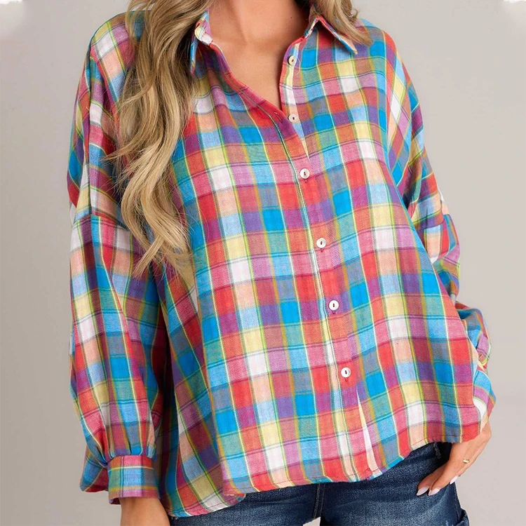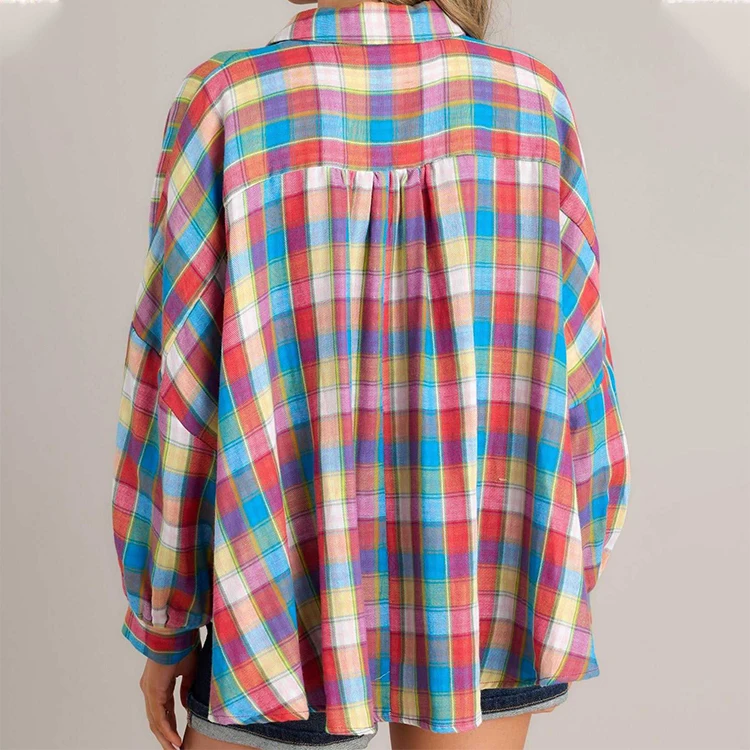 Custom High Quality Oversized Shirt Blouse Tops Custom Turn Down Collar Long Sleeves Plaid Button Design