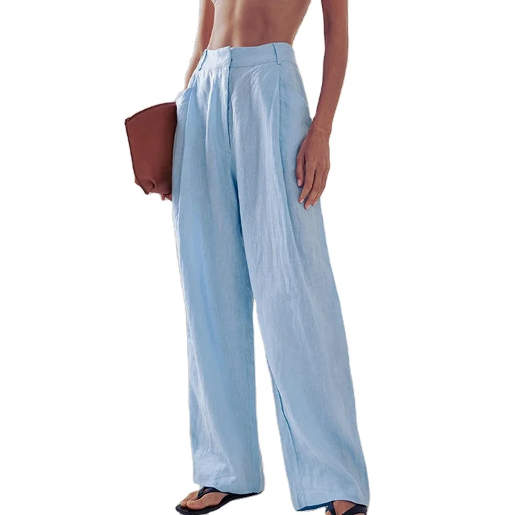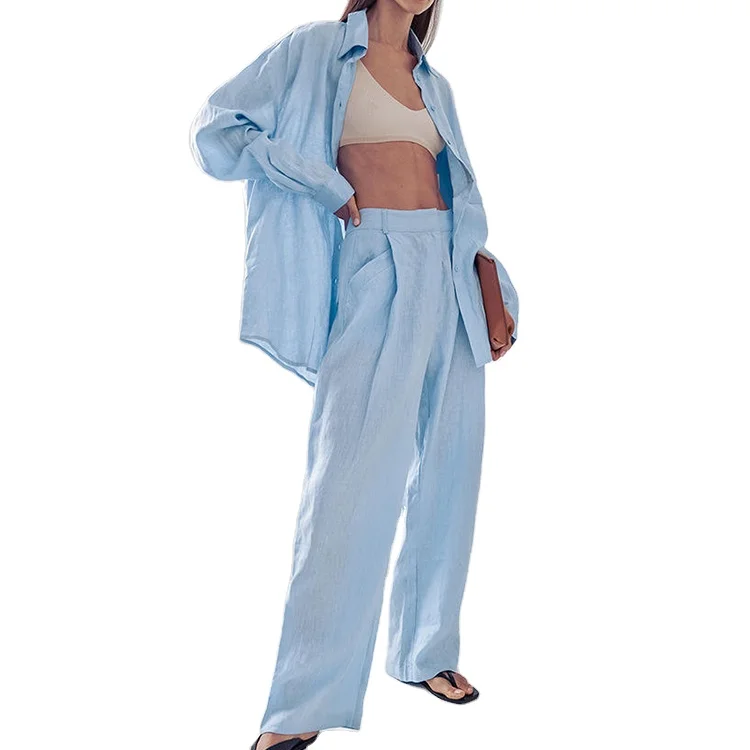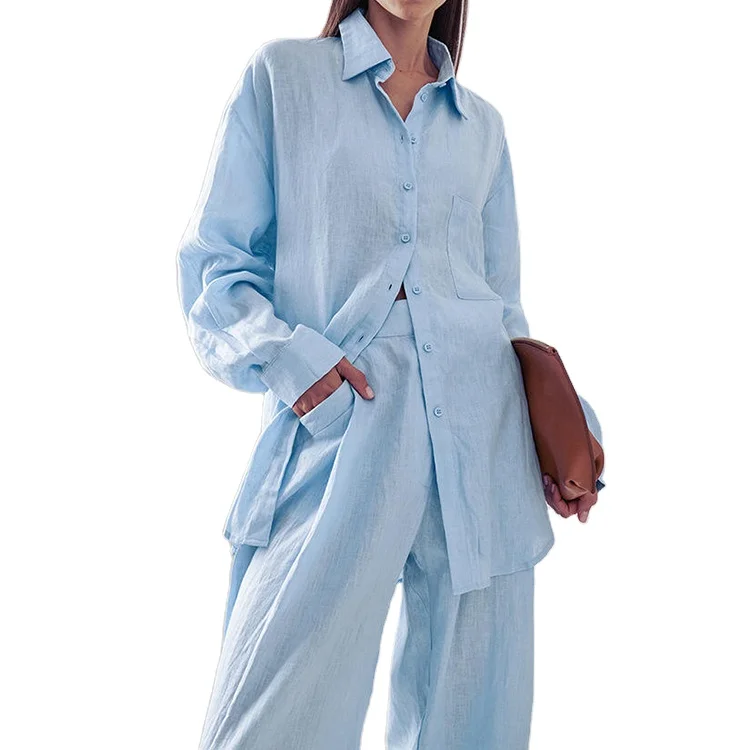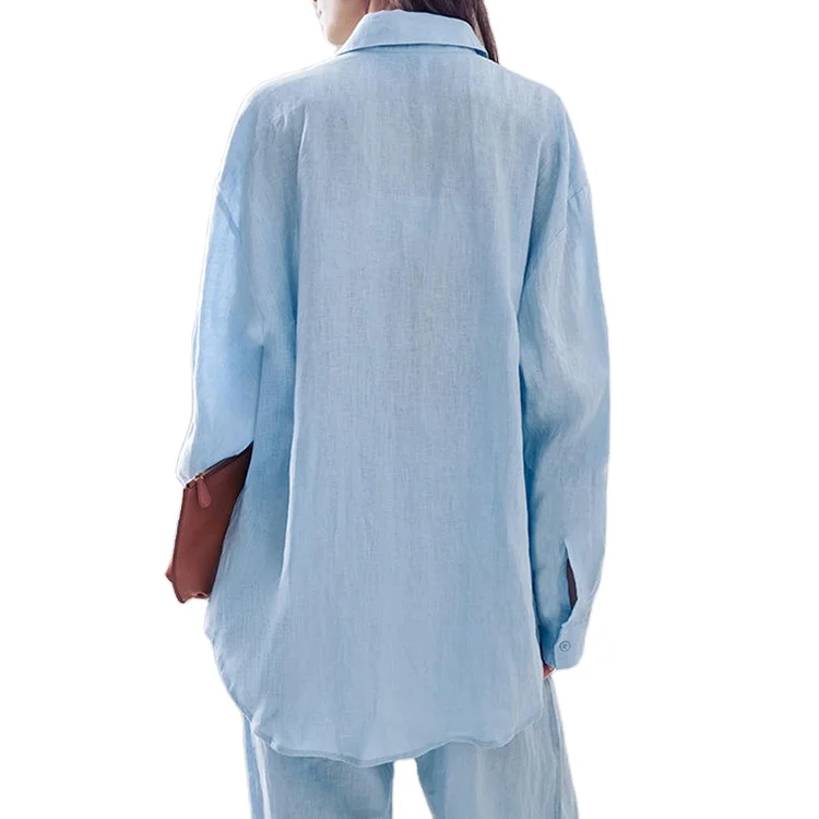 Custom High Quality Long Sleeve Shirt Pants Set Loose Cotton Linen Casual Two Piece Sets for Wome