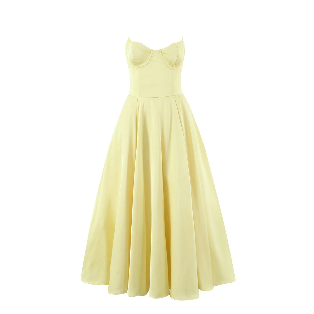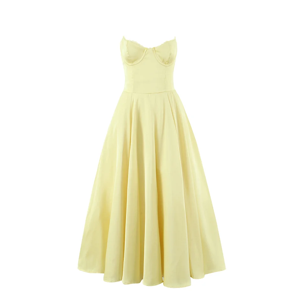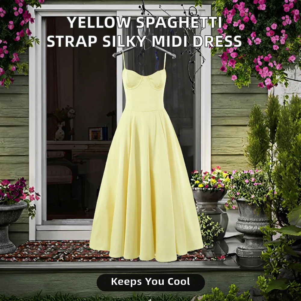 Yellow Woven Spaghetti Strap Back Zipper Fly Pleated Breathable Silky Casual Summer Midi Dress for Women with Lining