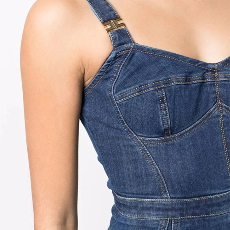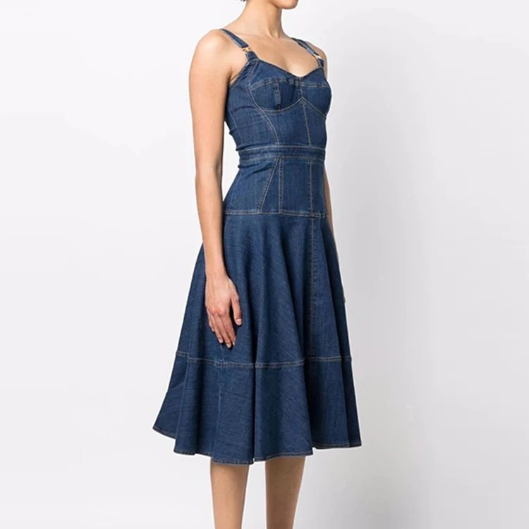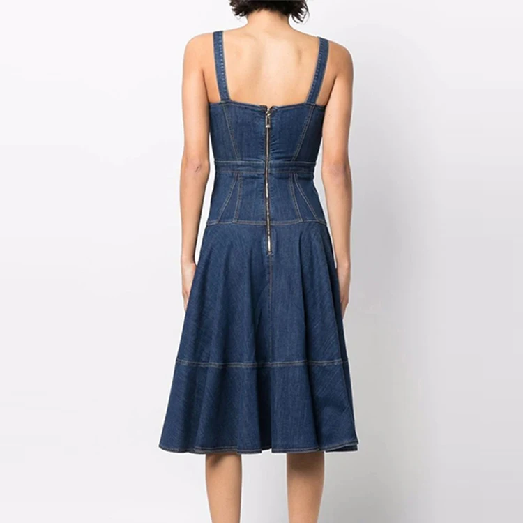 Custom High Quality Summer Sweet Solid Midi Jean Slip Dress Elegant Women Casual Denim Dresses