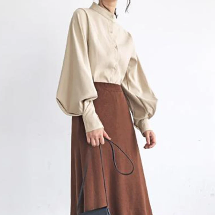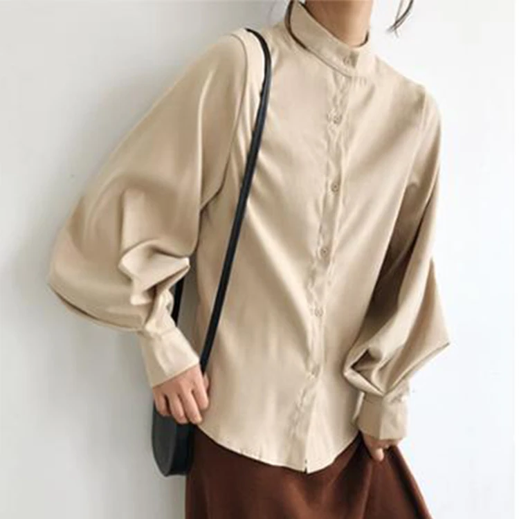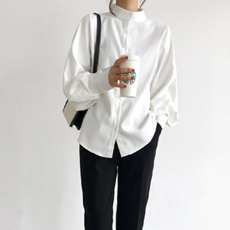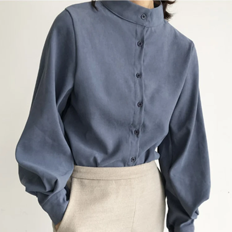 Custom High Quality Silk/Cotton Anti-Wrinkle Lantern Long Sleeve Women's Office Blouse with Solid Stand Collar for All Seasons