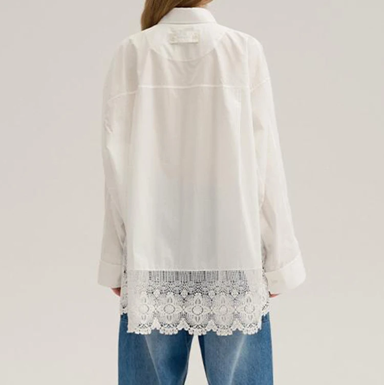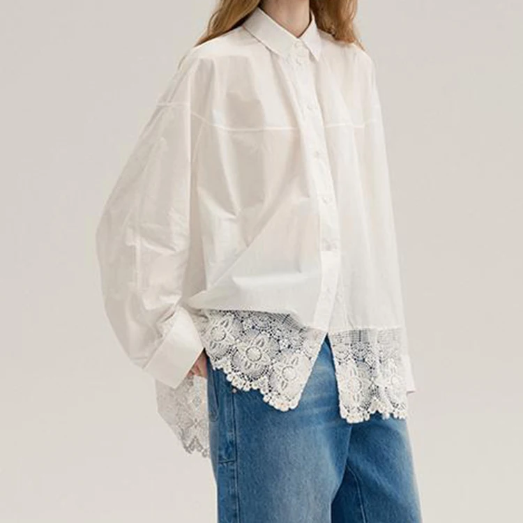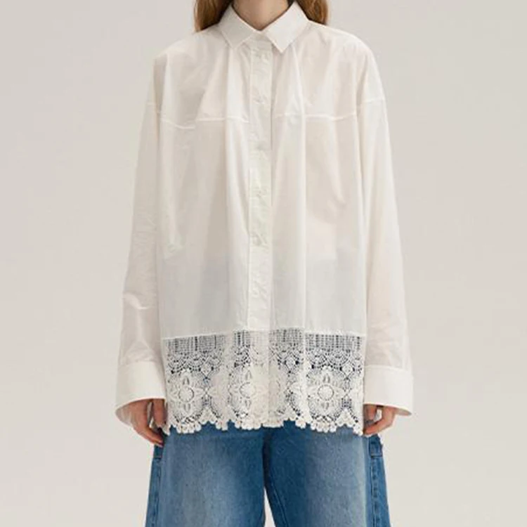 Custom High Quality Turn Down Collar Embroidery Lace White drop Shoulder Long Sleeve Buttons up Blouse