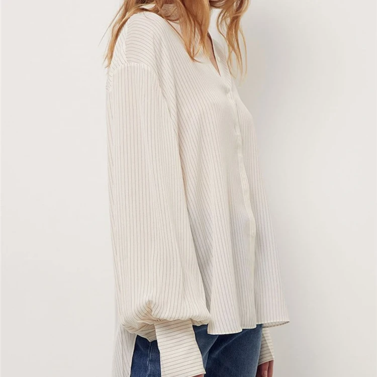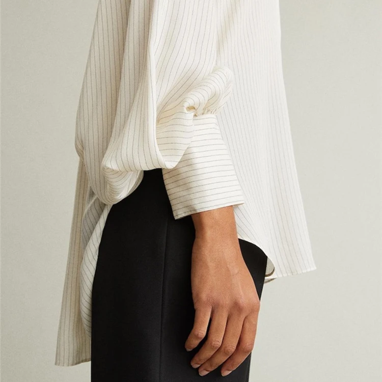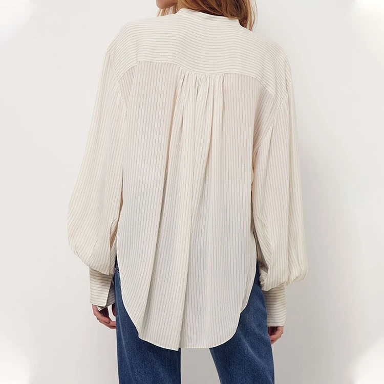 Custom High Quality Custom Women's Blouses Lantern Sleeve Stand Collar Irregular Striped Loose Tops