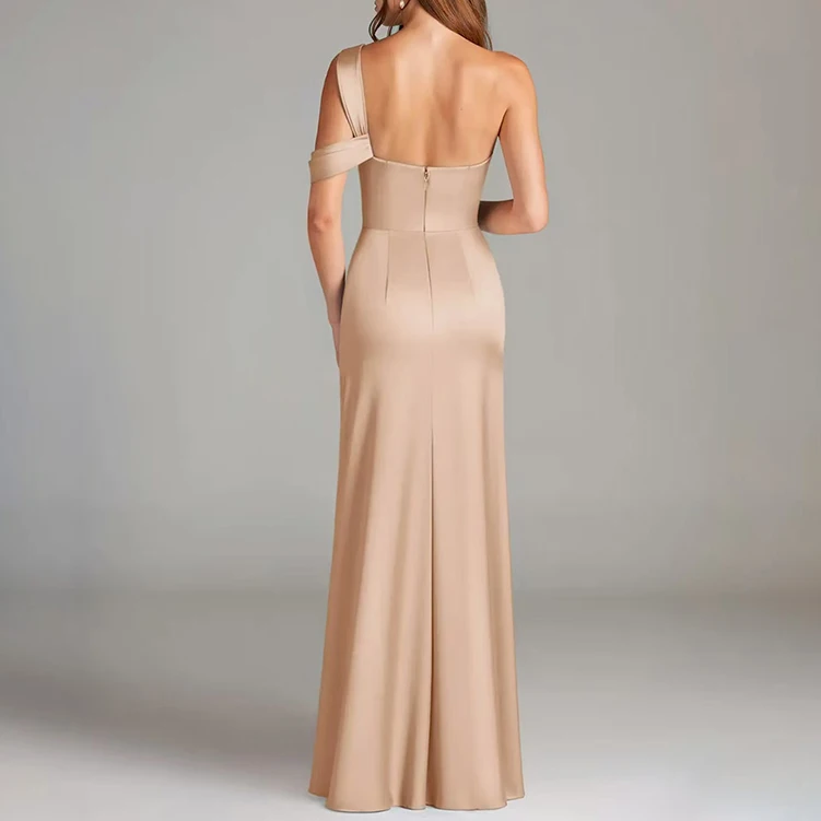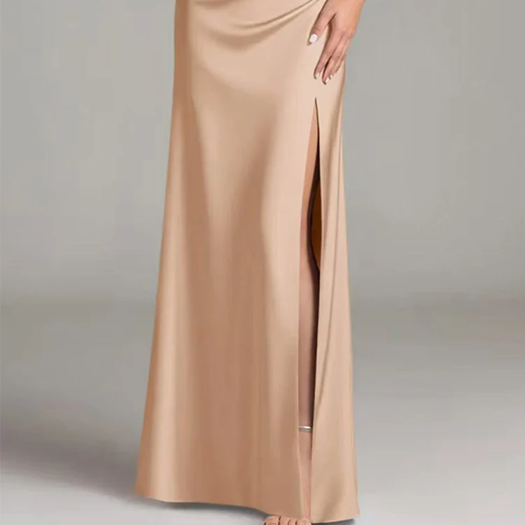 Custom High Quality Off Shoulder Satin Fabric Ruched Waist High Slit Design Mermaid Maxi Length Elegant Women's Dress