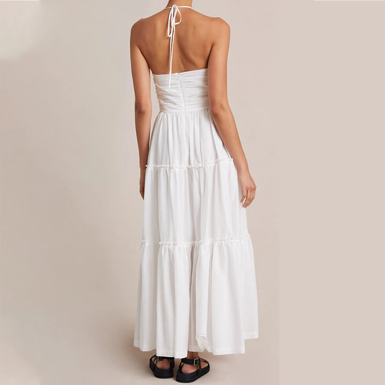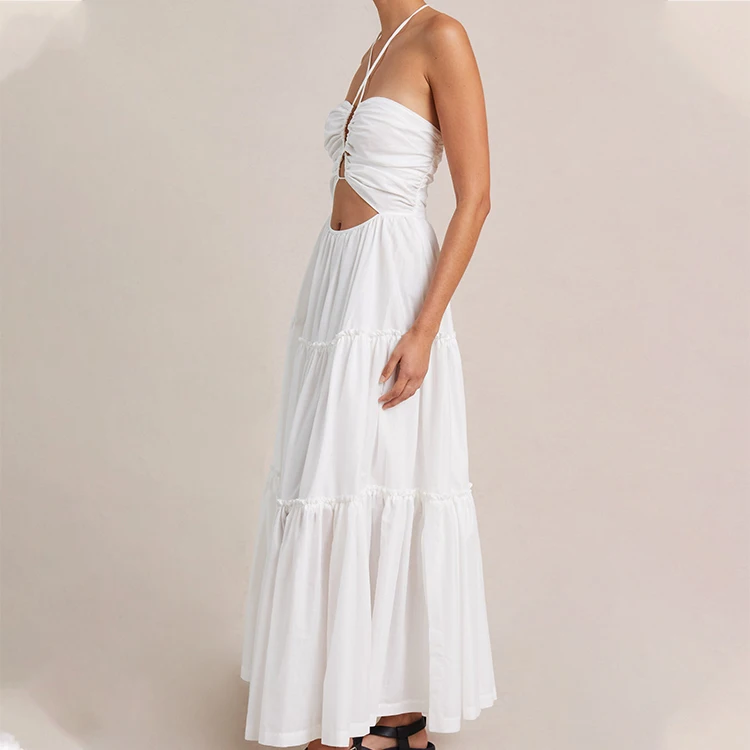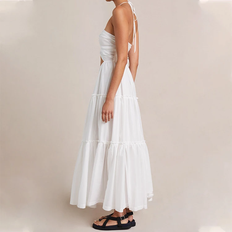 Custom High Quality Spring Summer Solid Woven Breathable Sexy Halter Neck Cut Out Bust Pleated A-Line Midi Casual Dress
