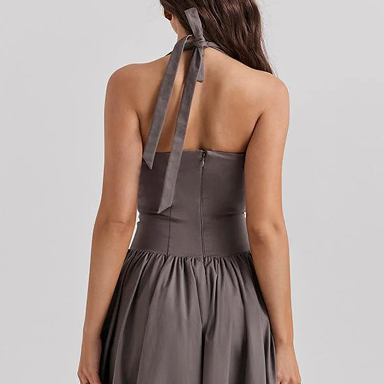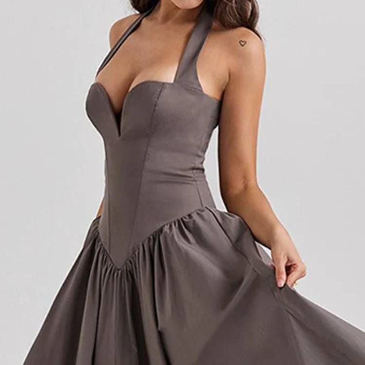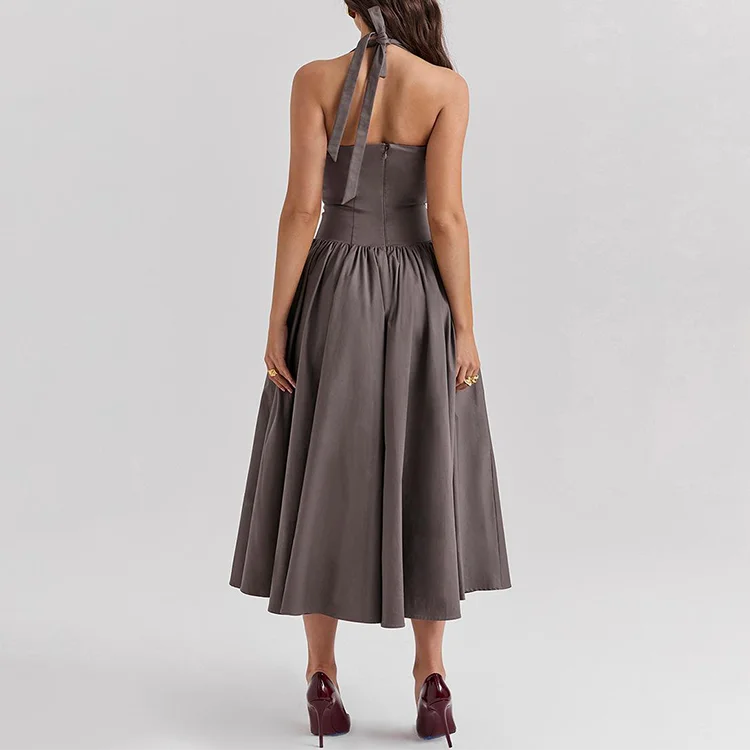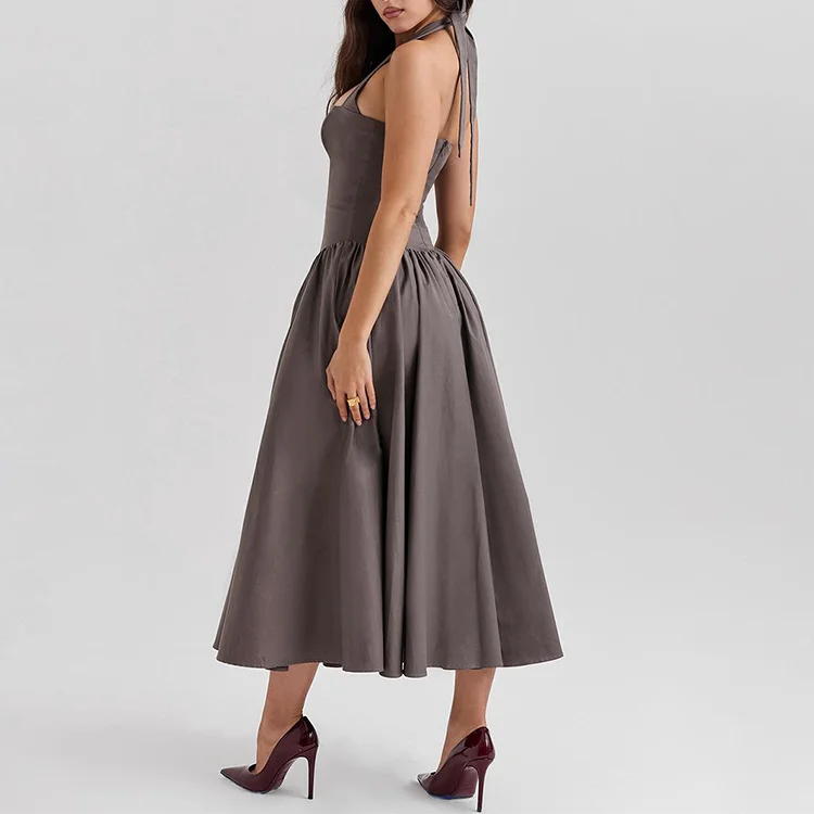 Custom High Quality Vintage Inspired Halter Midi Dress with Translucent Fabric for Elegant Office Lady & Formal Occasions