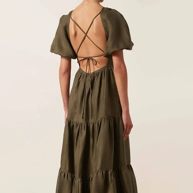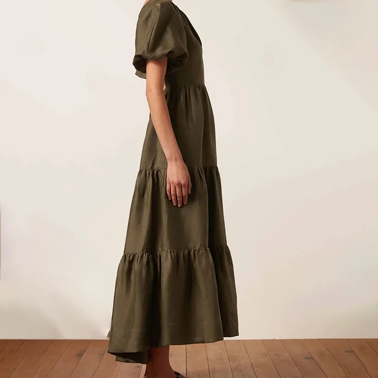 Custom High Quality Eco-Friendly Casual Ruffles Puff Sleeve Linen O Neck Spring Summer Maxi Dress for Girls