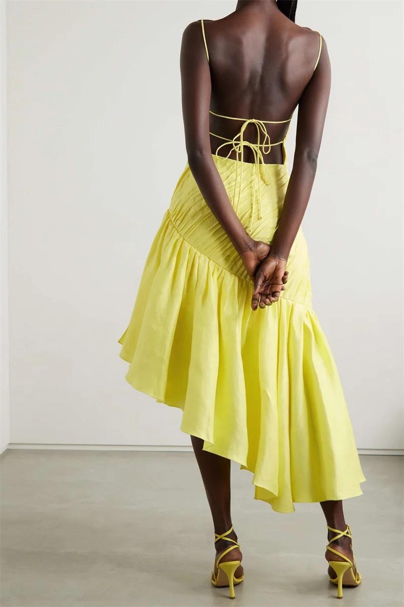 Custom High Quality Elegant Summer Slit Open Back Adjustable Ties Yellow Ruched Asymmetric Ruffled Women Long Dress