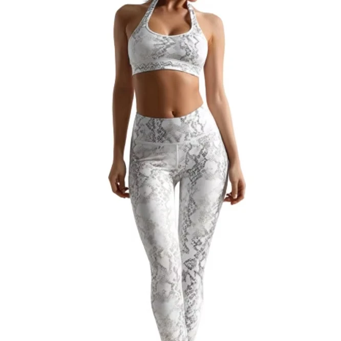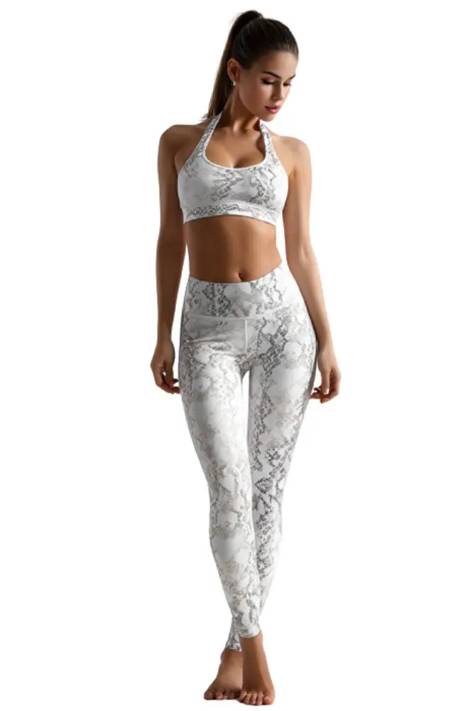 Women's Lock-In Tummy Yoga Set | Galaxy Silver Python-Print Leggings & Seamless Bra | Buttery-Soft Gym-to-Street Athleisure Wear