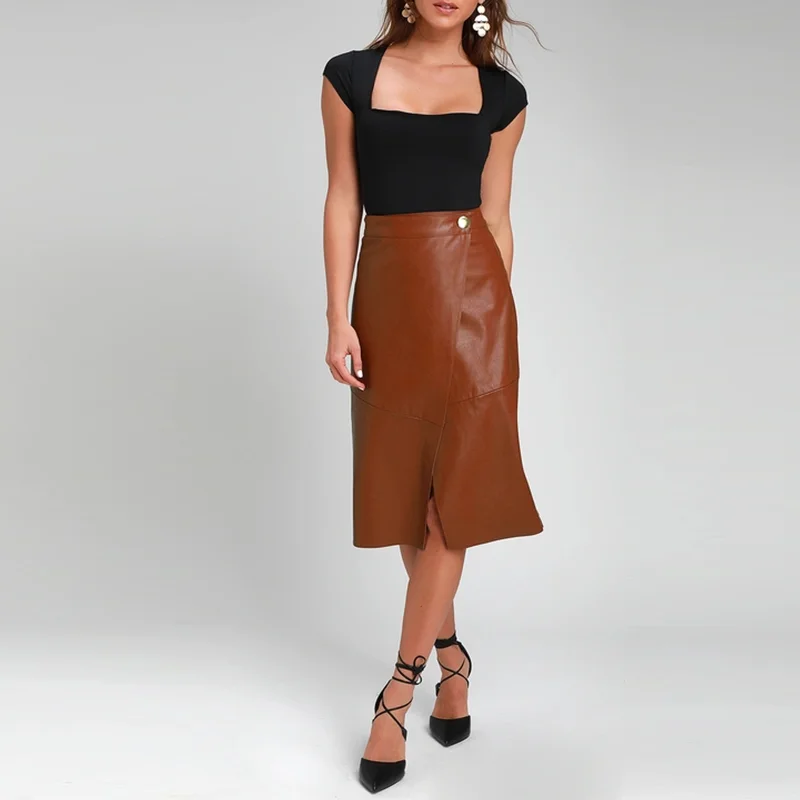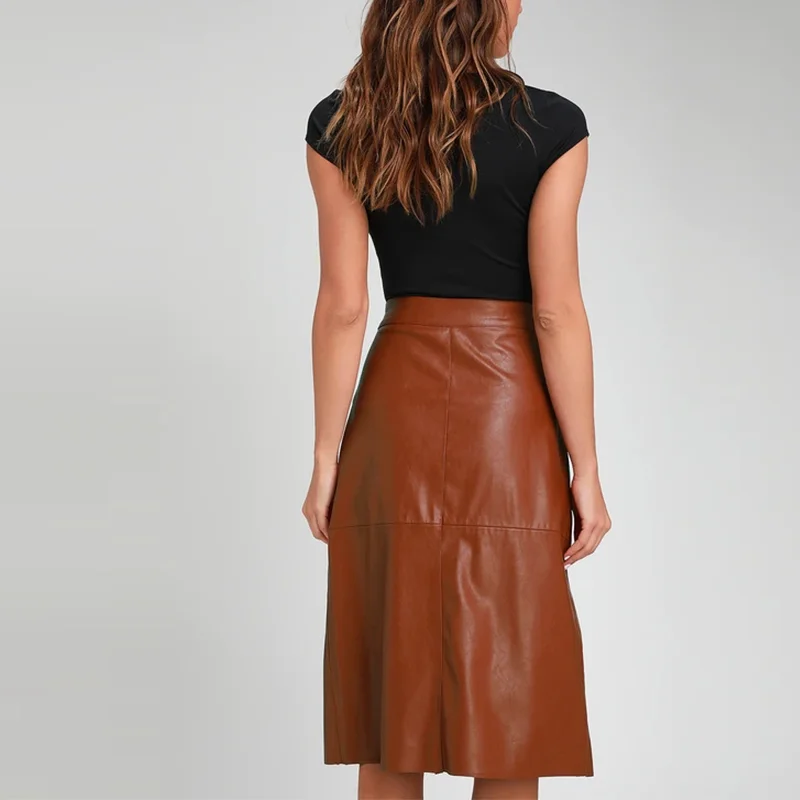 Custom New Style Vegan Leather a Line High Waist Wrap Midi Skirt Women Office Ladies