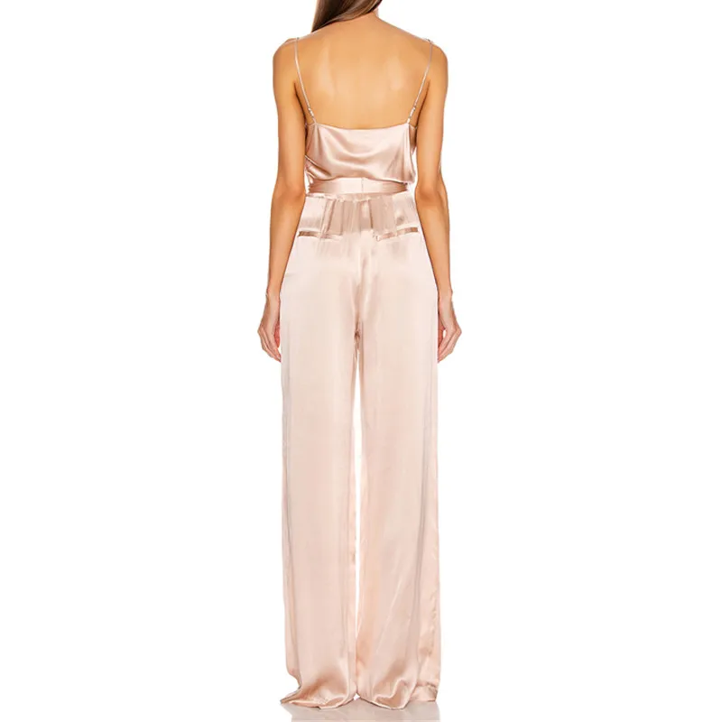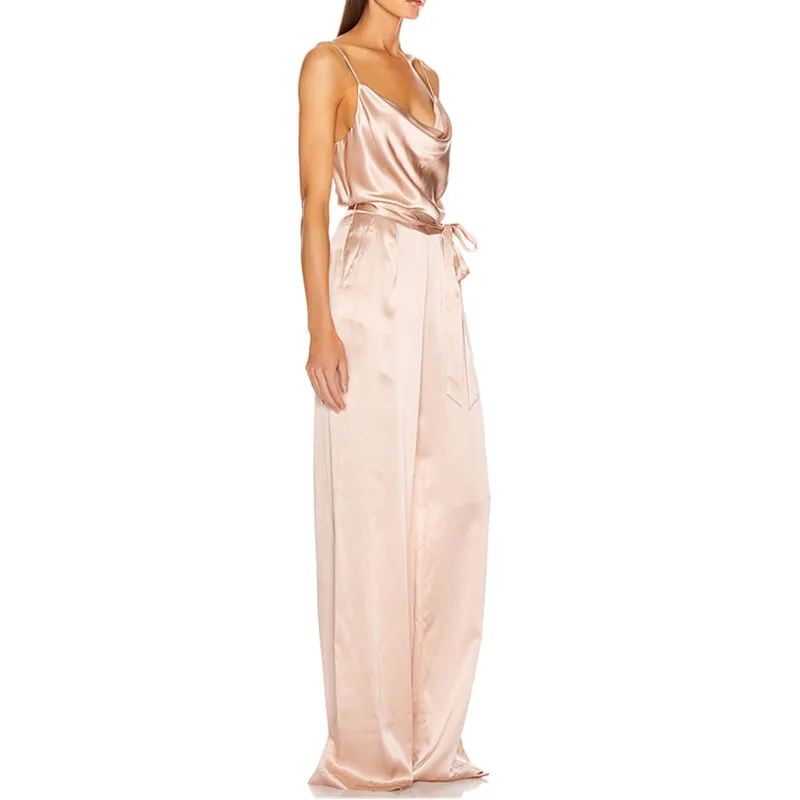 Sleeveless Satin Waist Tie Office Casual Women One Piece Jumpsuit with Long Pants