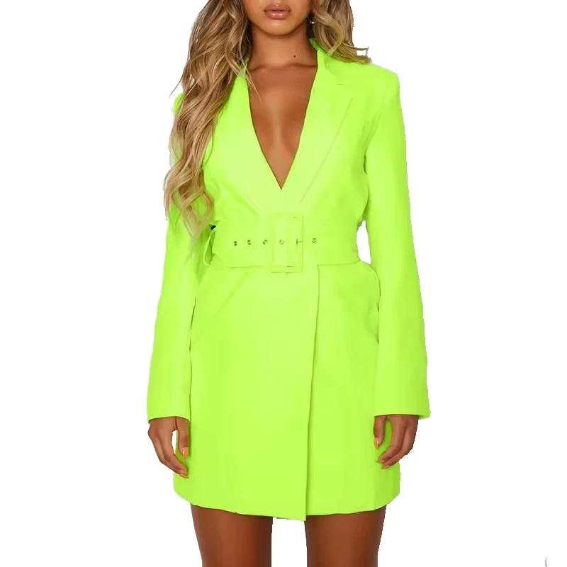 Neon Green Ladies Long Sleeve Belted Waist Casual Daily Mini Dress Women Office Dresses