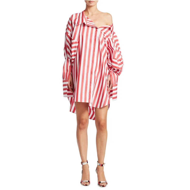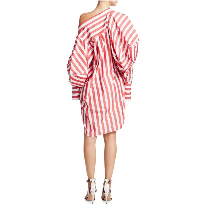 Asymmetric Striped Long Puff Sleeve Casual Women Shirt Dress Dresses