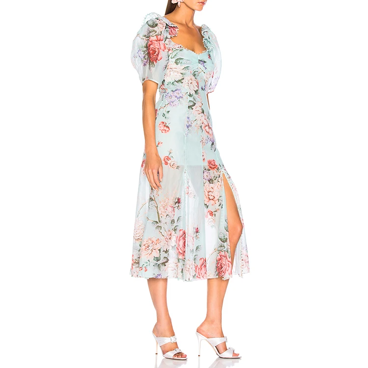 Ladies Print Dress Puff Sleeve Waist Loose Side Split Women Casual Dress