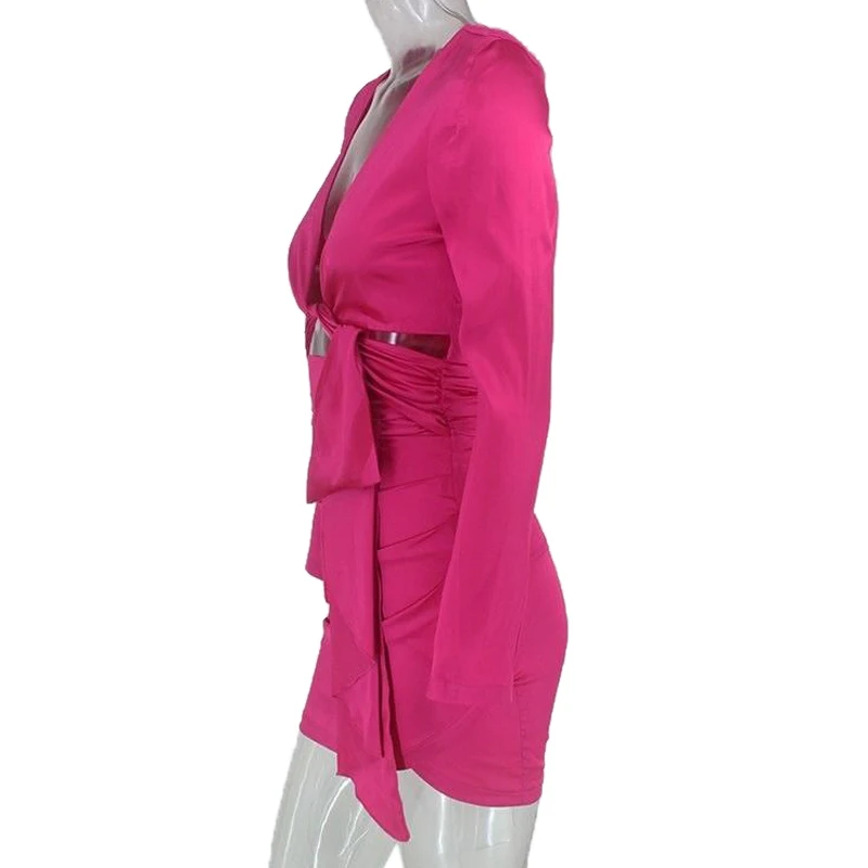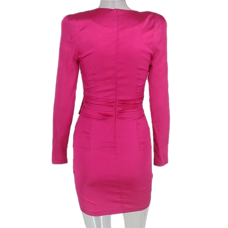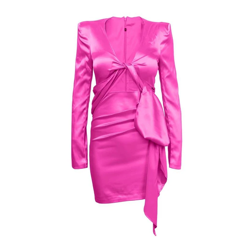 Long Sleeve Sexy Hot Pink Satin Kylie Jenner Style Night Party Dress Women