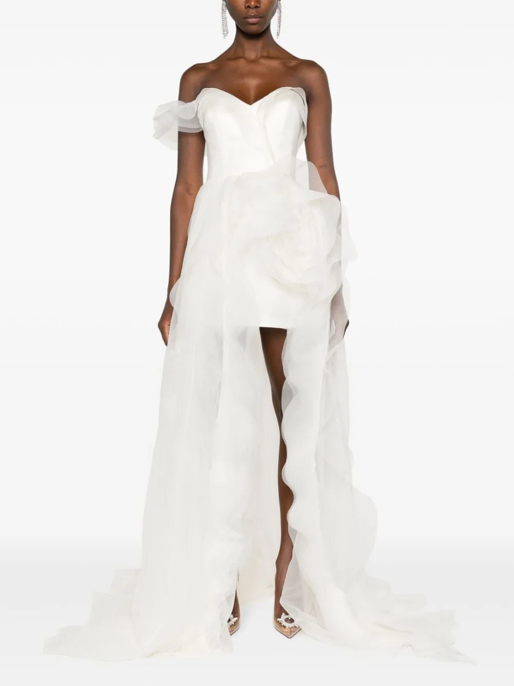 ZYHT 73903 Gemstone Crystal 3D Flower Decoration Ruched One Shoulder High Slit Long Sleeve Maxi Simple Elegant Evening Dress