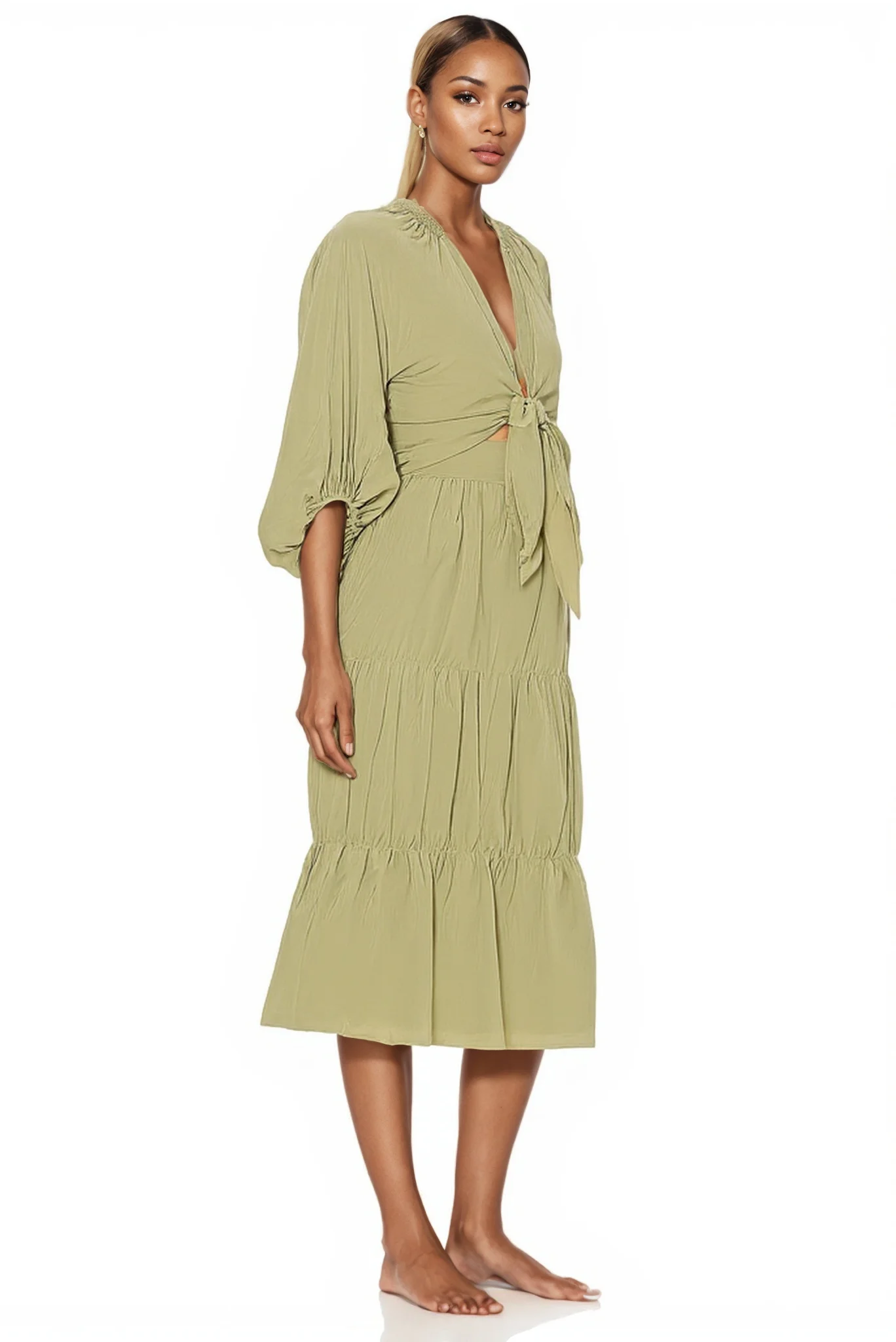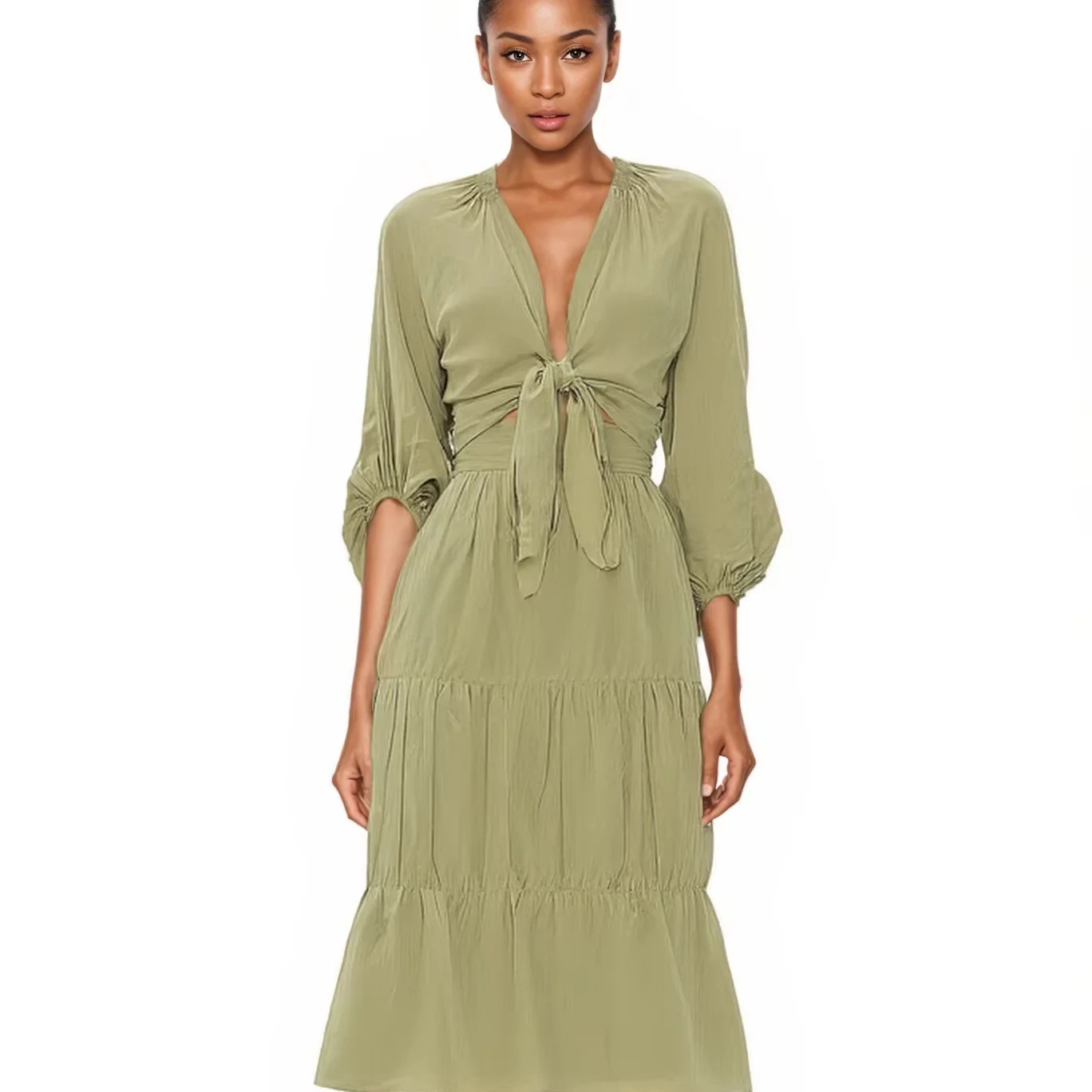 ZYHT 82053 Apricot Lace Top with Tiered Ruffled Sleeves V-Neck & Gold Buttons Blouse Wanita Elegan Women Blouse