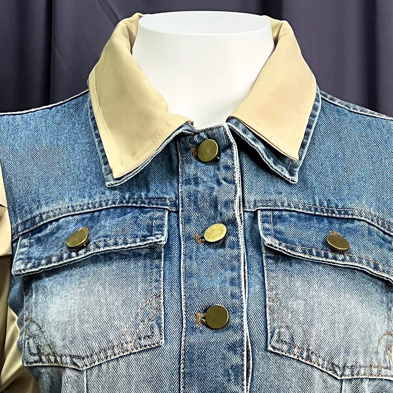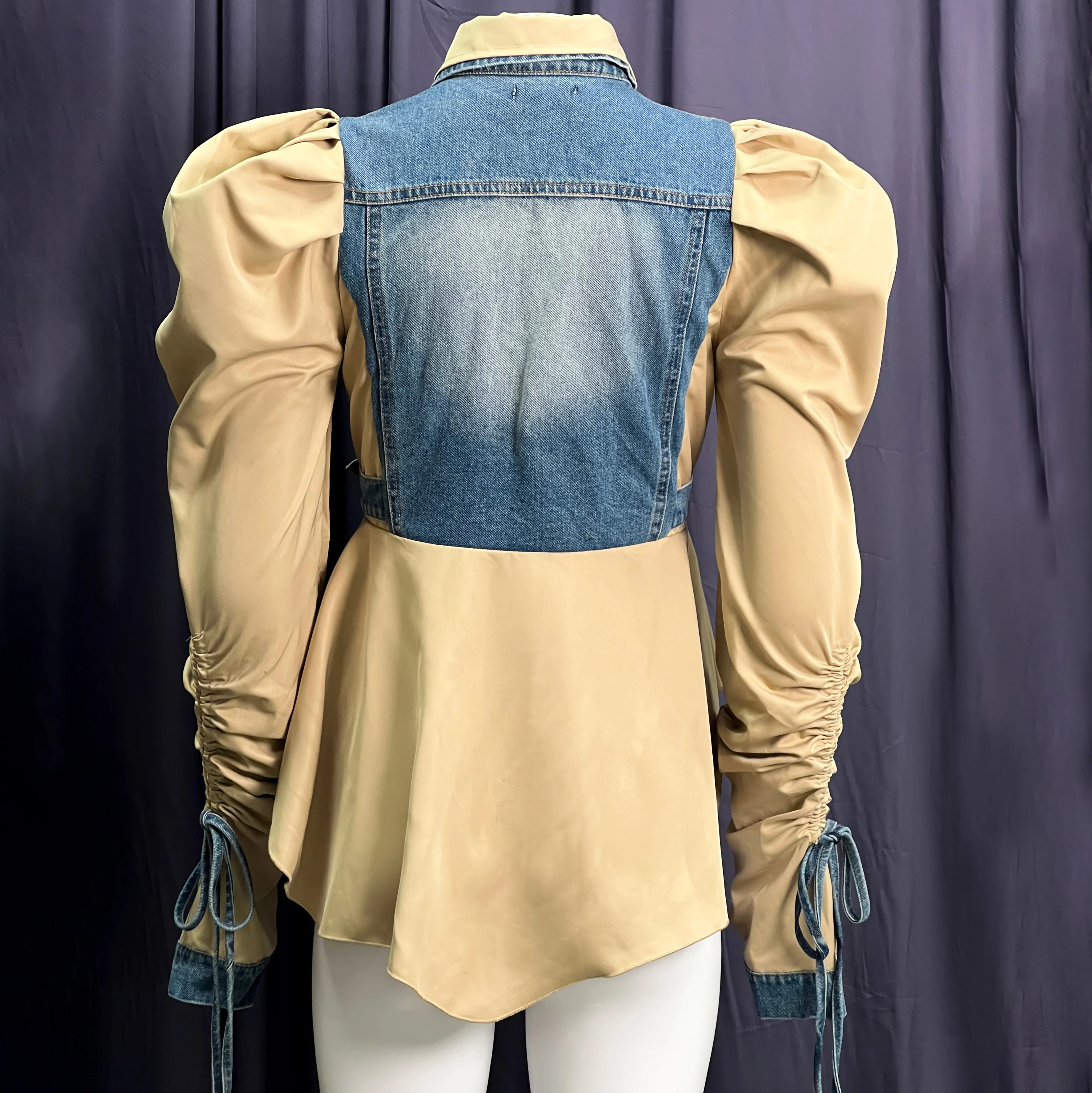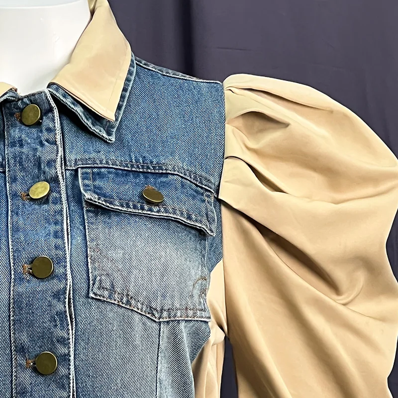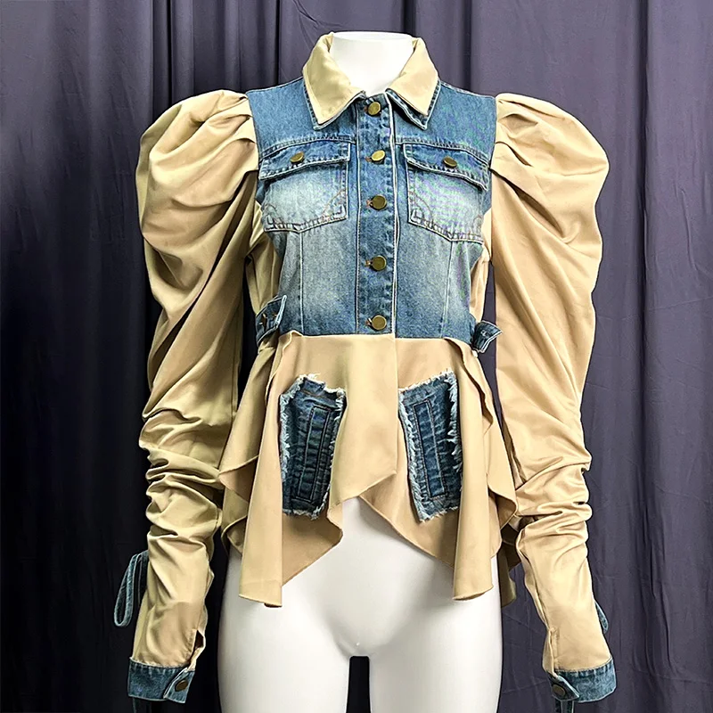 Hot Sale Fashion Ladies Denim Shirt Splicing Contrasting Color Puff Sleeve Sexy Denim Top