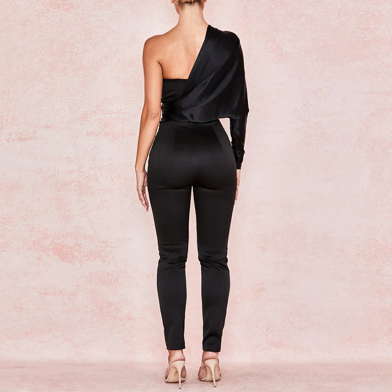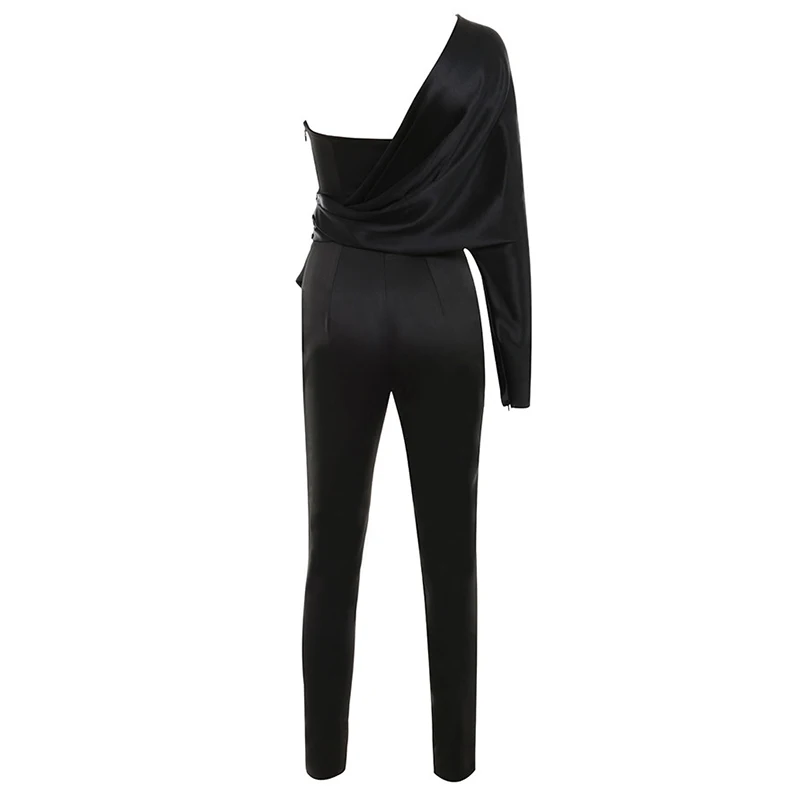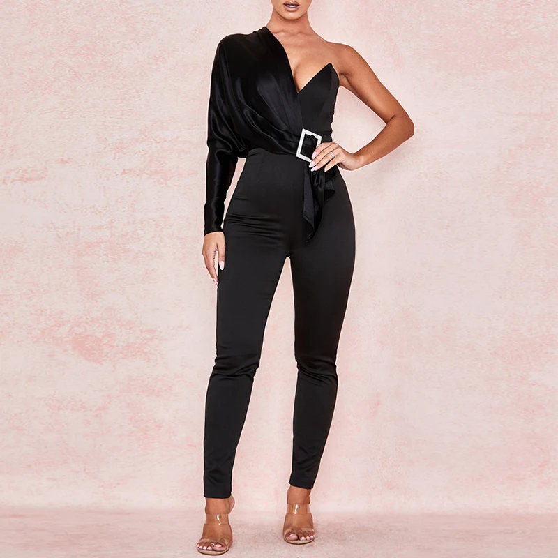 Ladies Black Satin Crystal Single Sleeve Belt Office One Piece Jumpsuit with Long Pants