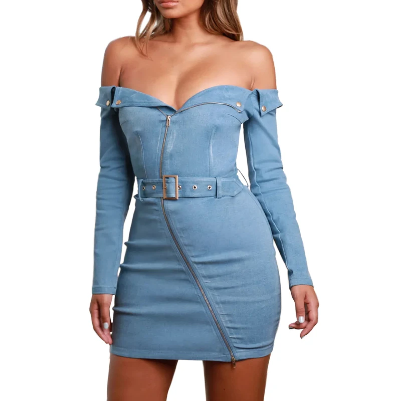 Off Shoulder Denim Full Sleeve Bardot Mini Dress Women Fashion Clothing Casual Dresses