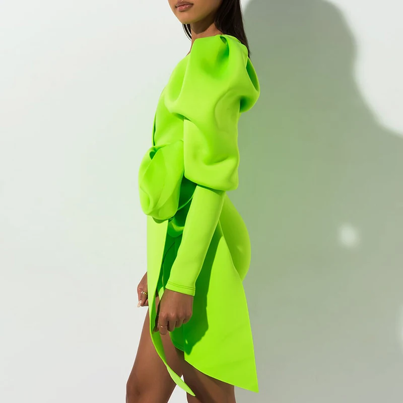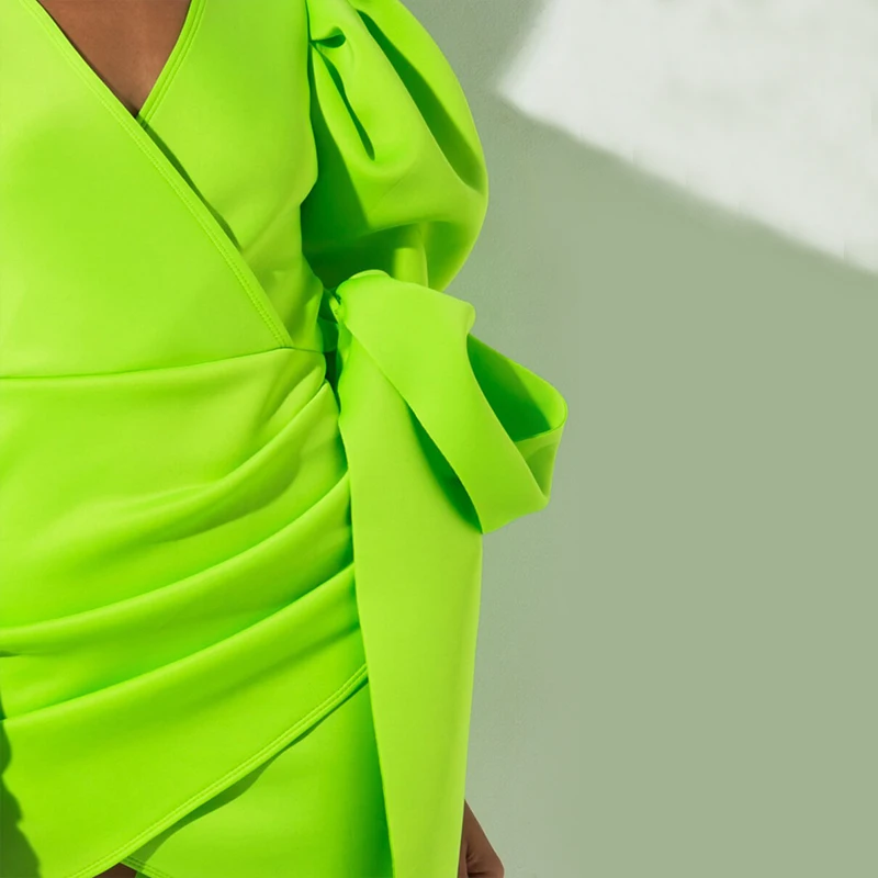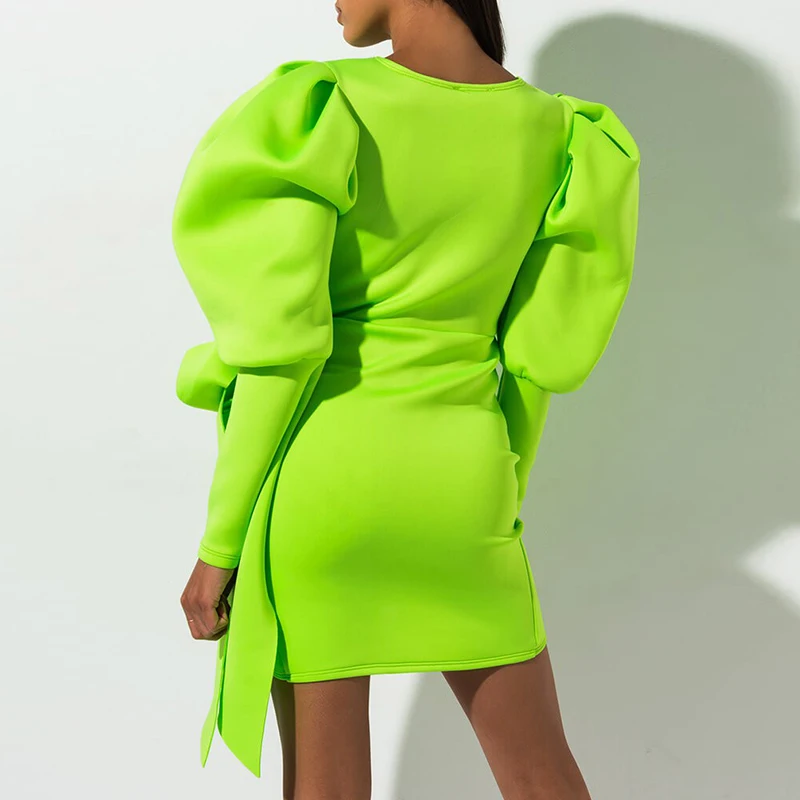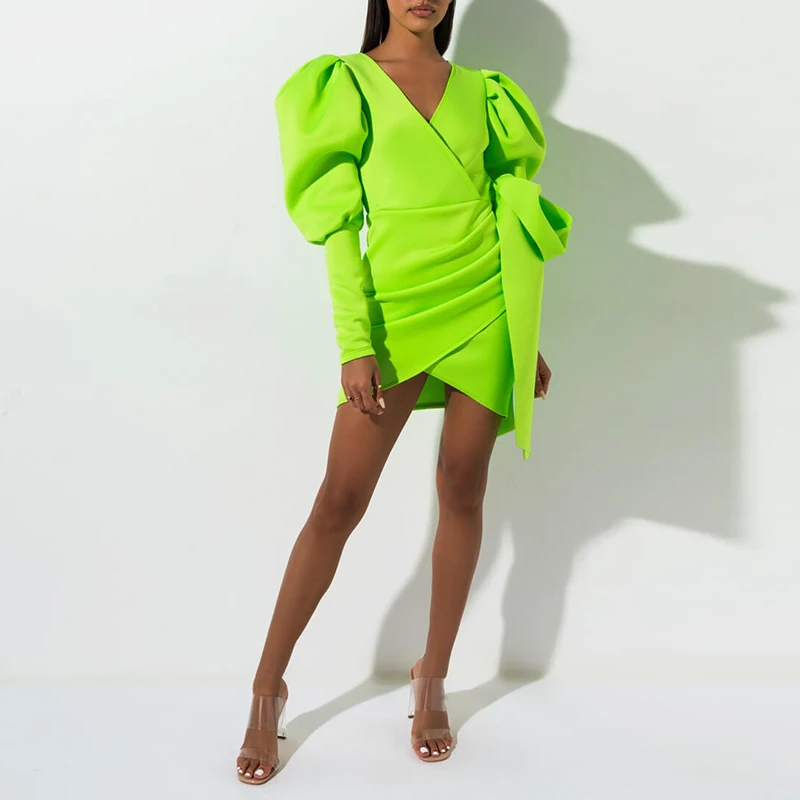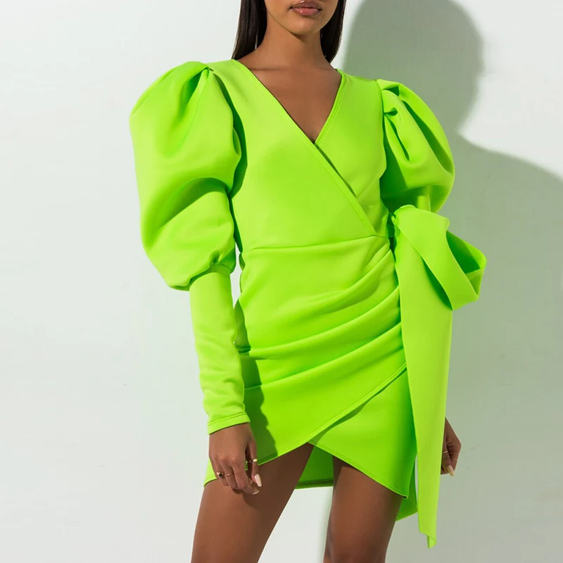 Neon Lime Long Puff Sleeve Wrap Fashion Mini Dress Women Party Night Out Dresses