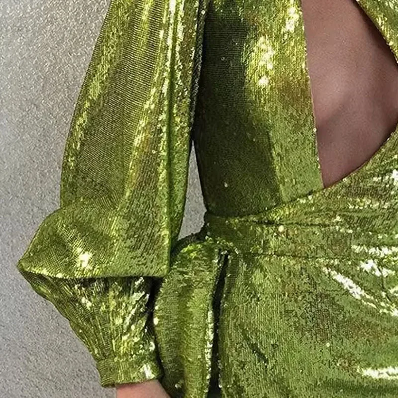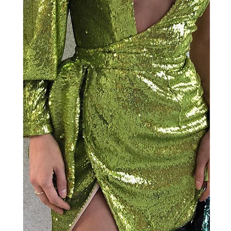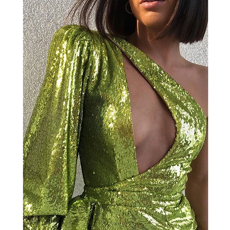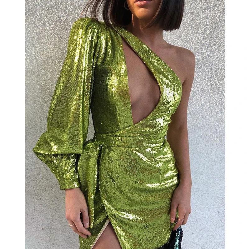 Women One Shoulder Cutout Sequin Slit Dress Spring Party Wear Short Club Dresses