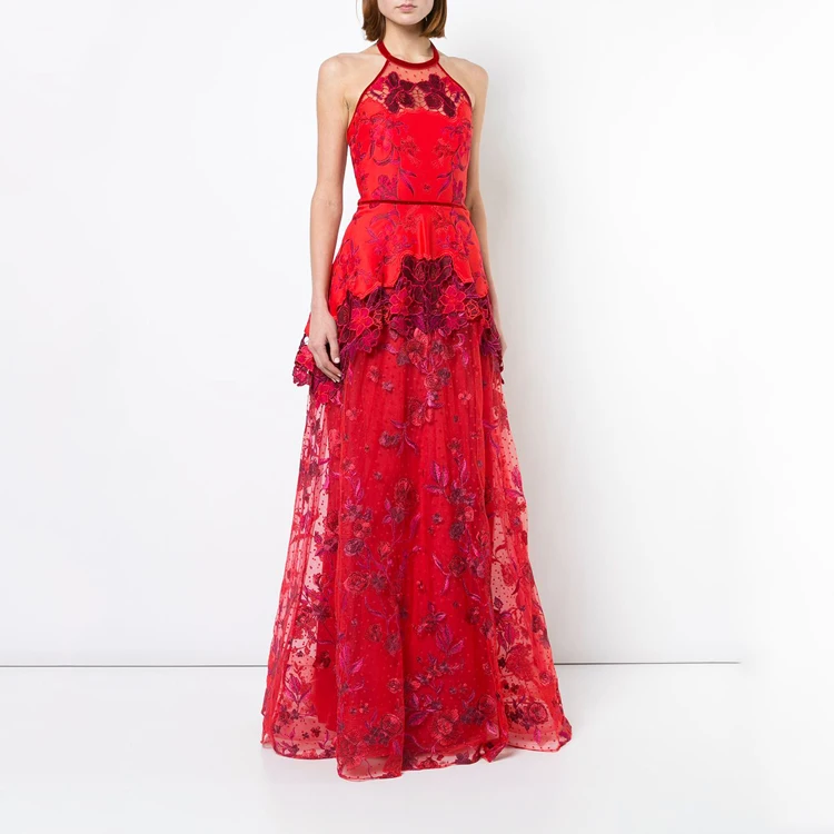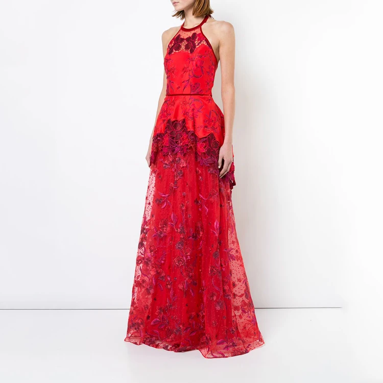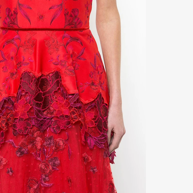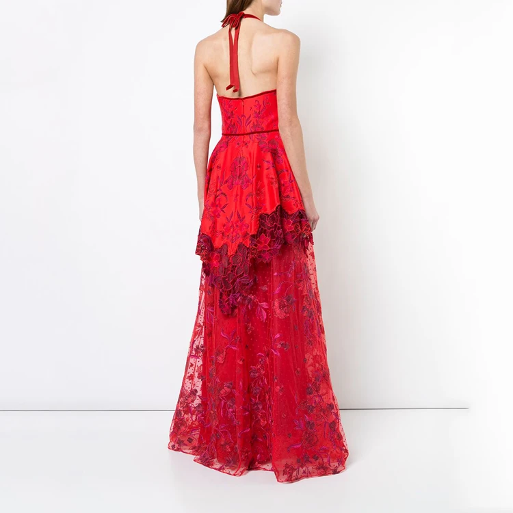 Custom ladies sexy dress straps multi-layer lace women senior red evening dress