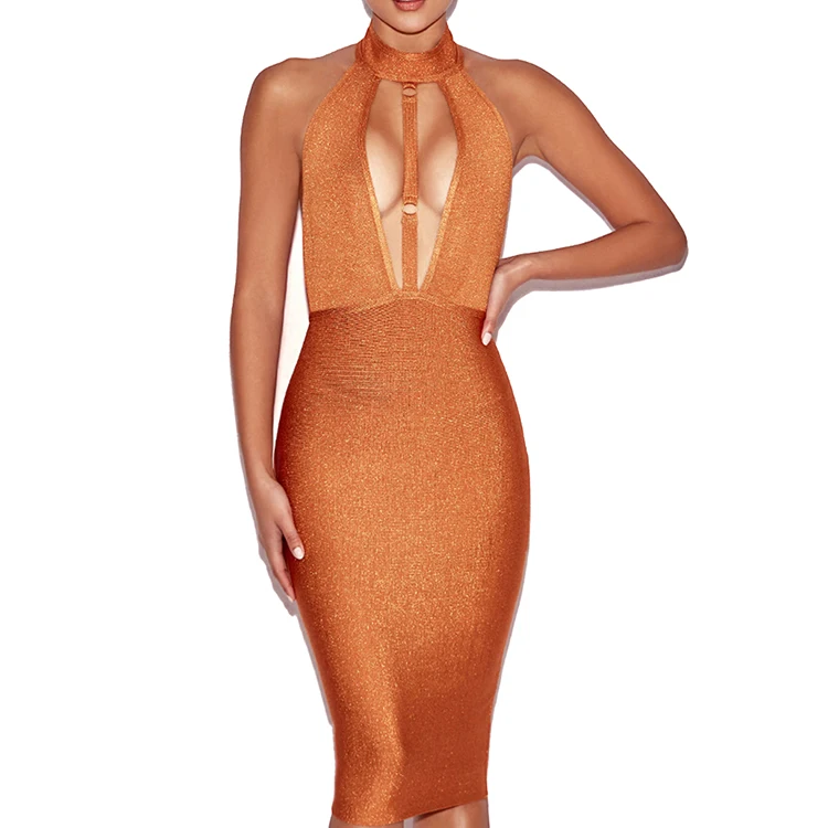Cutout Sexy Lady Evening Gown Bandage Sleeveless Tight midi Orange Ladies Party Dress