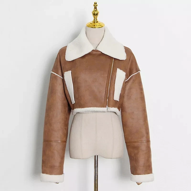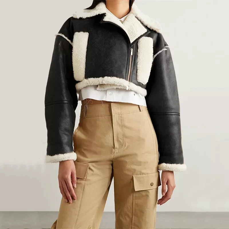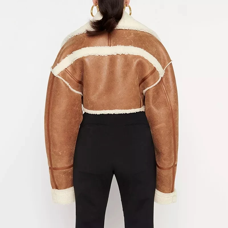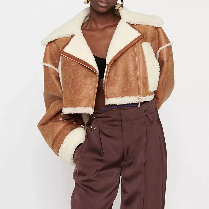 Fake leather Fur Color block Patchwork Lapel Collar Long Sleeve High Waist Short winter bomber Jacket