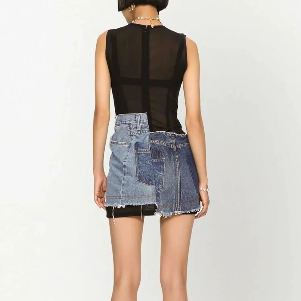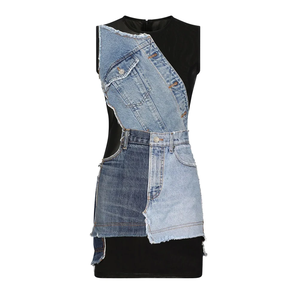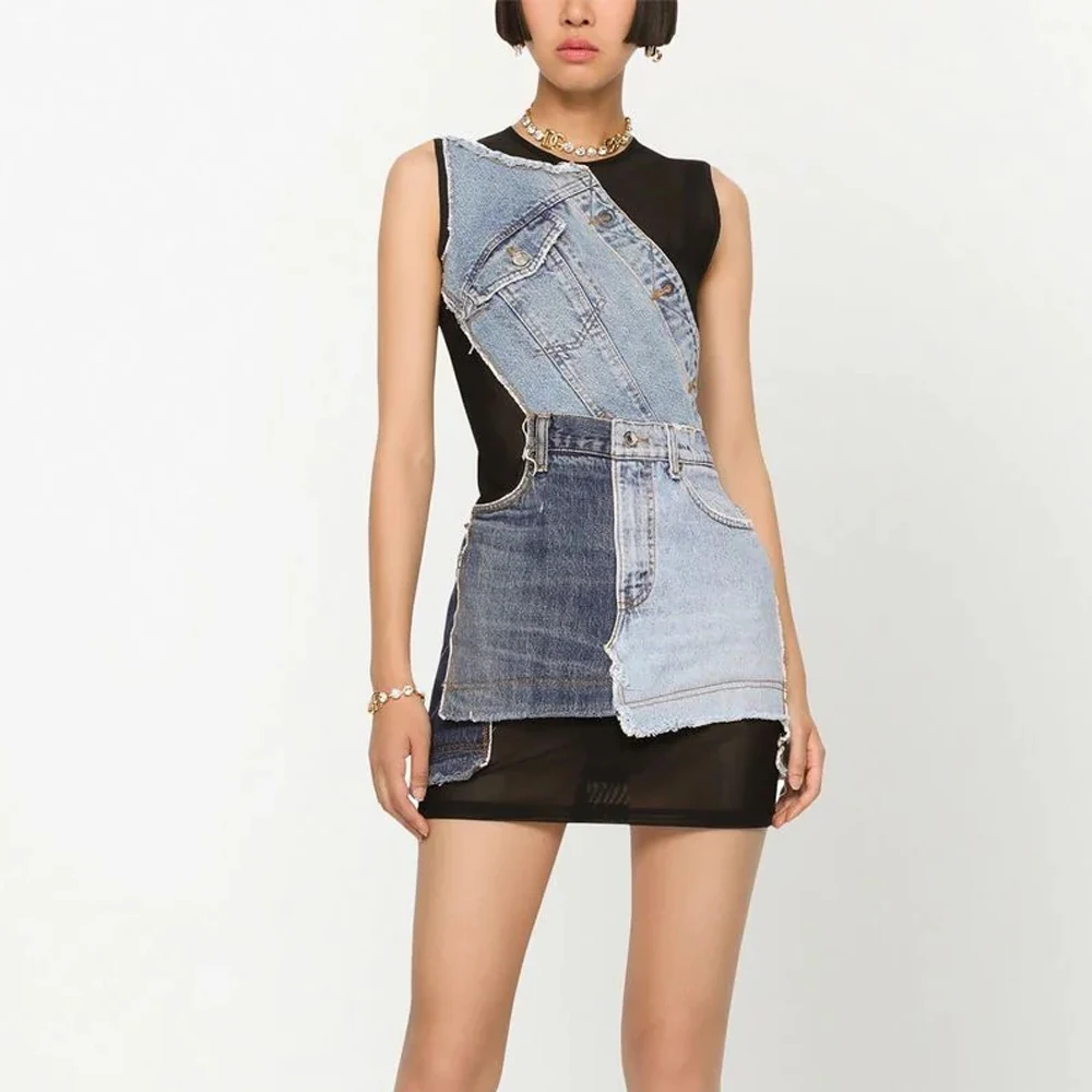 High Quality Sleeveless Vintage Denim Dress Women Mesh Patchwork Sexy Jean Dresses