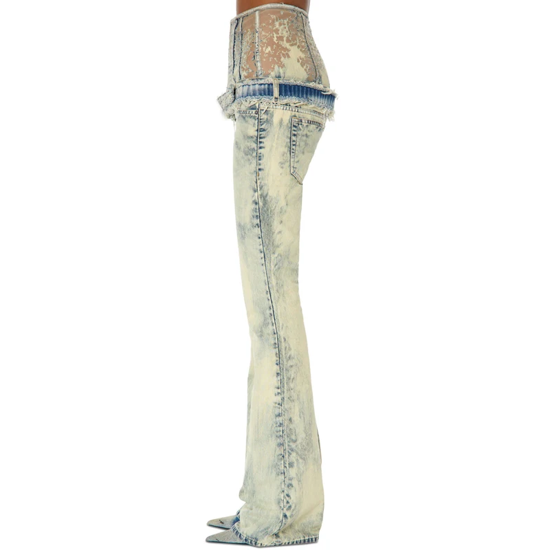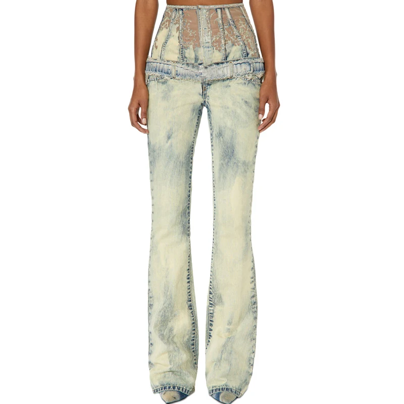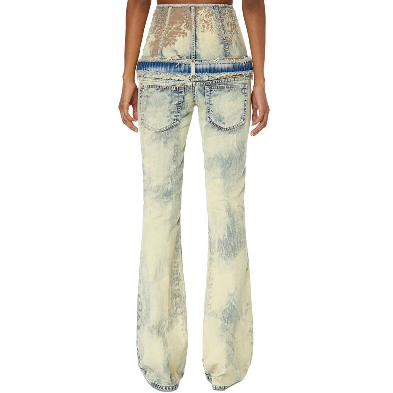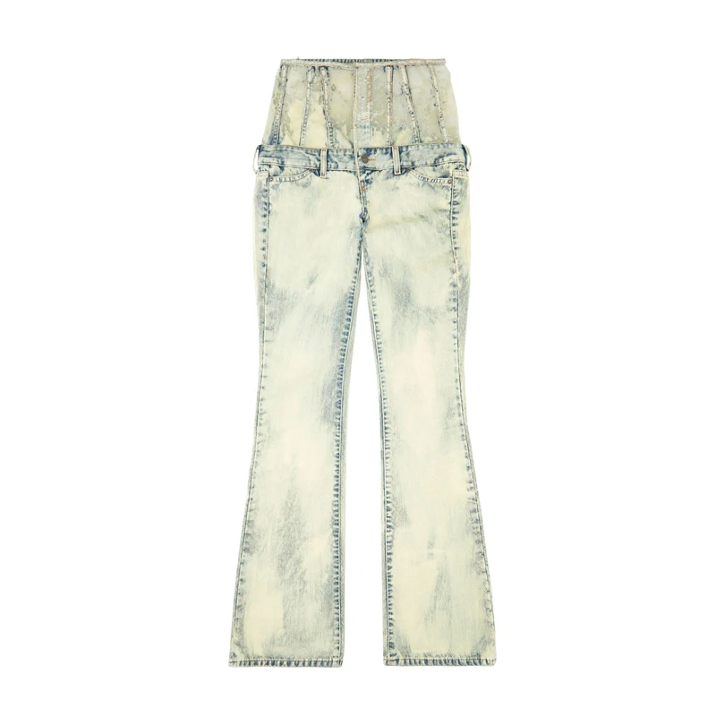Custom Stonewashed 100% Cotton Jeans Burnt Float Effect Ladies Denim Flared Pants