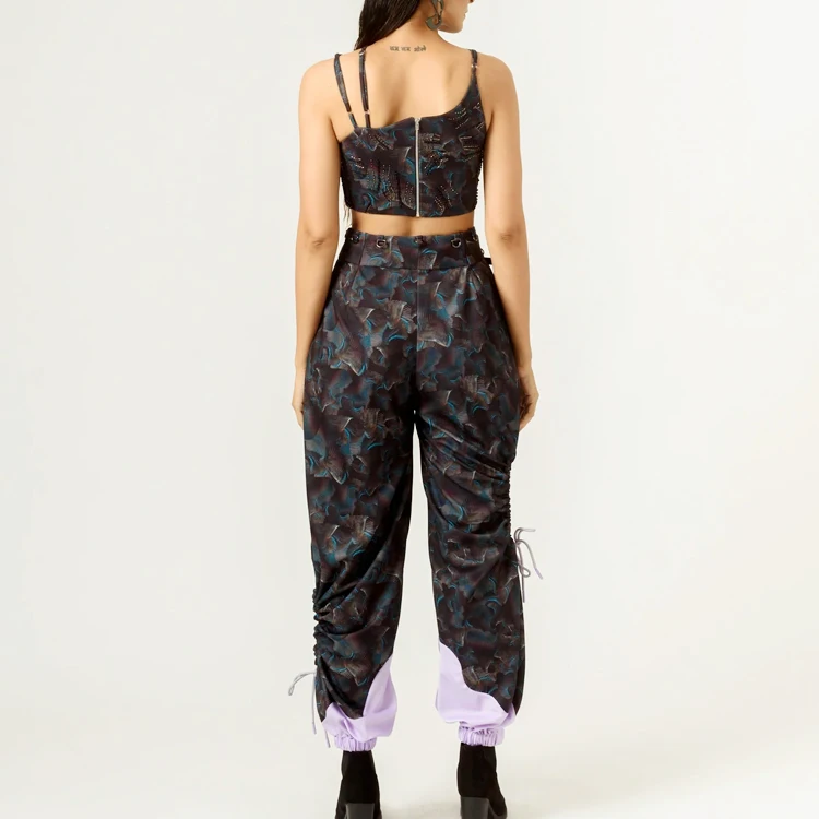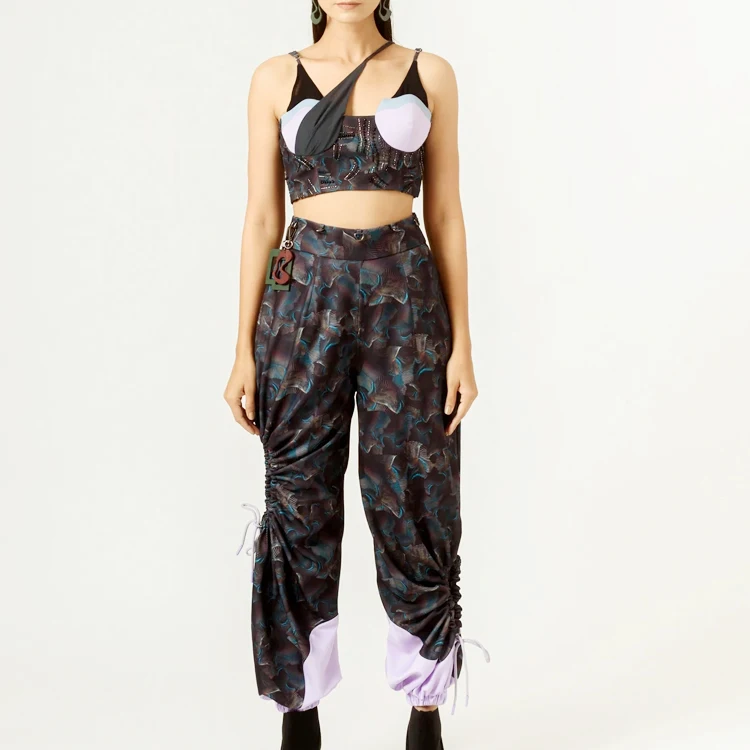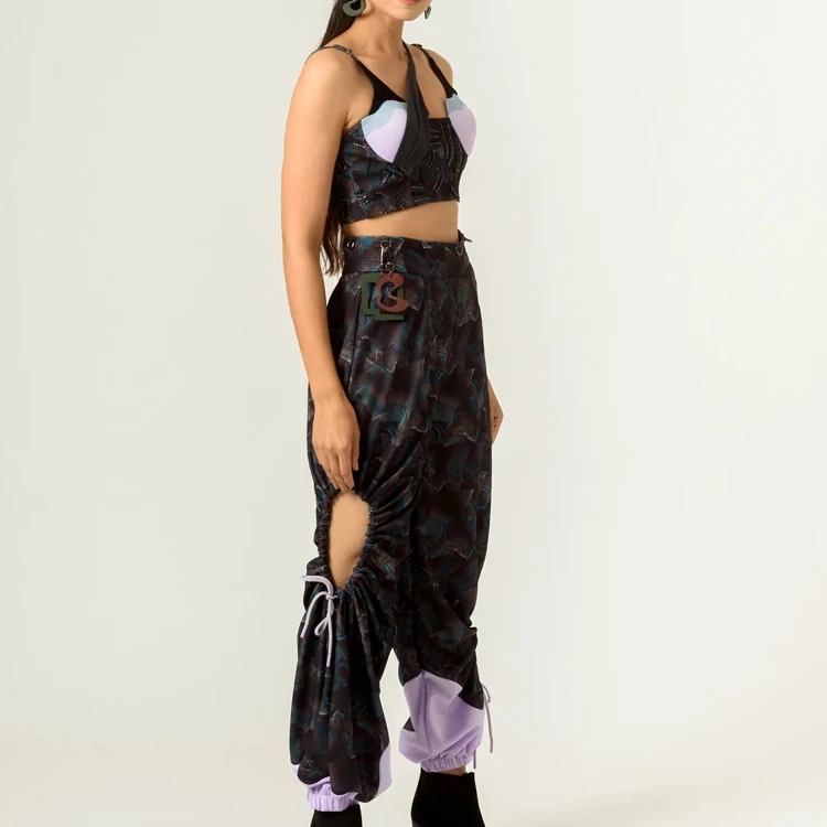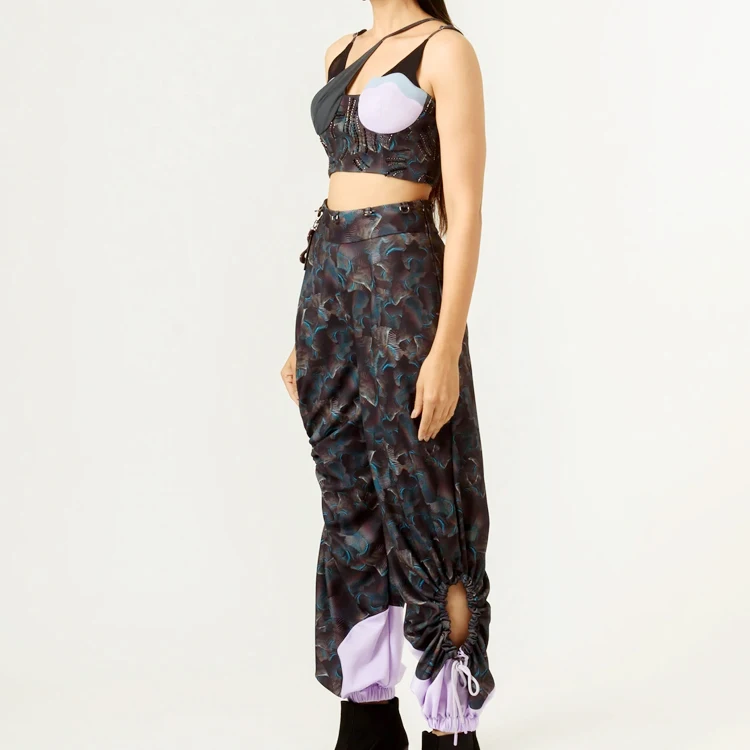 OEM patchwork side hollow out drawstring women long sexy satin print pants
