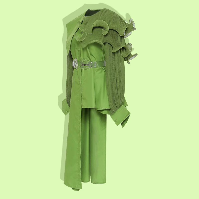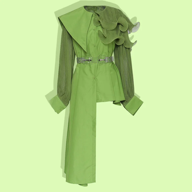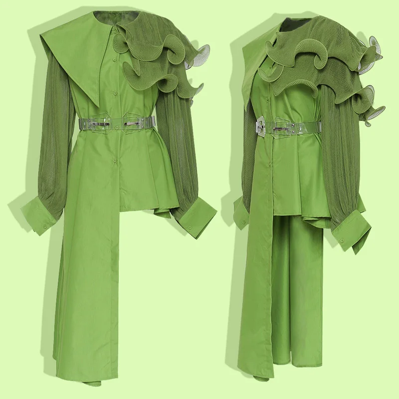 Super heavy industry retro women's top irregular stitching pleated women shirt skirt with belt