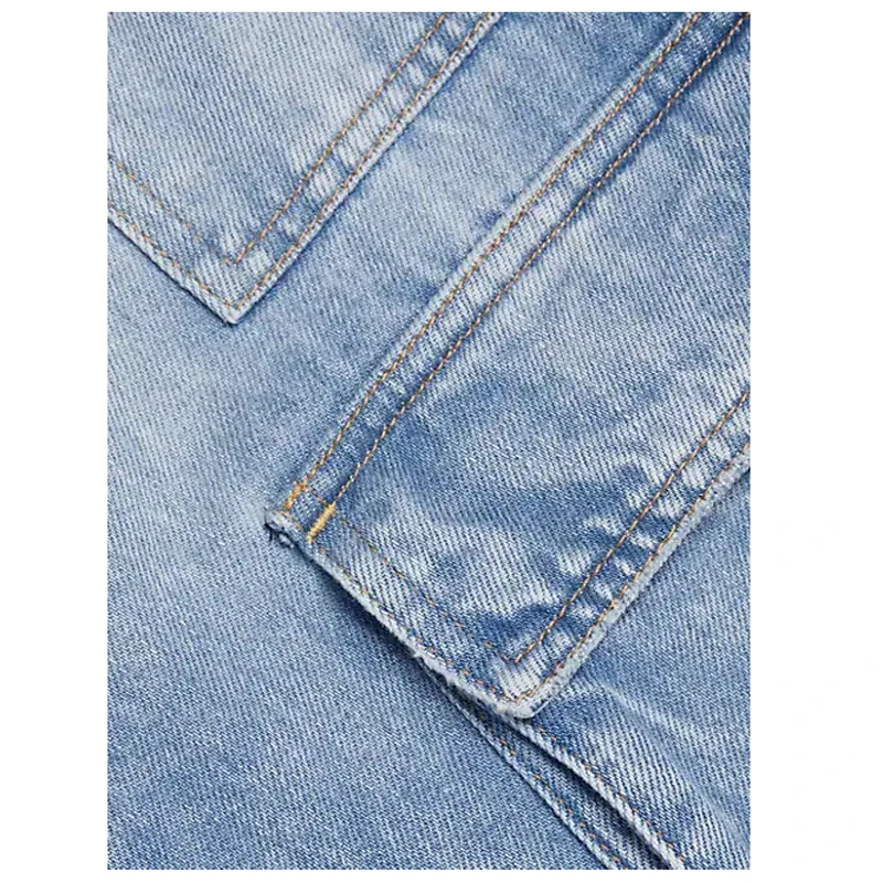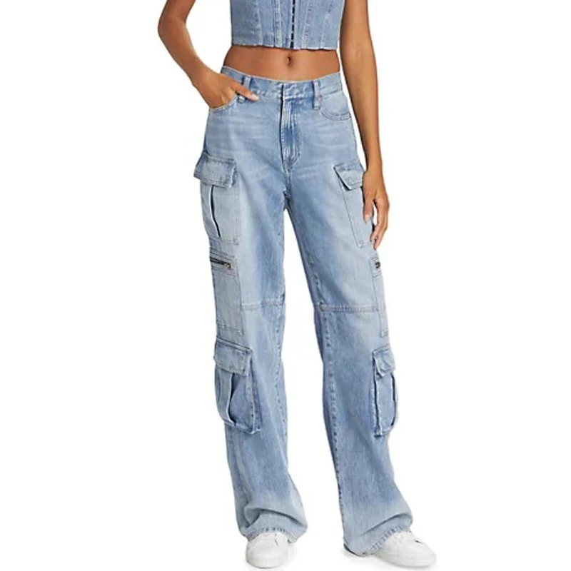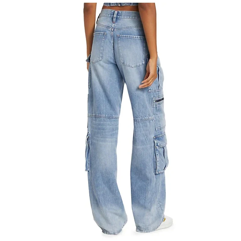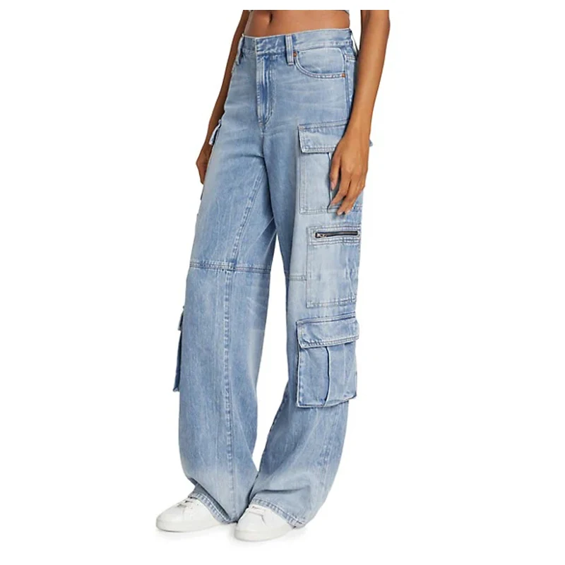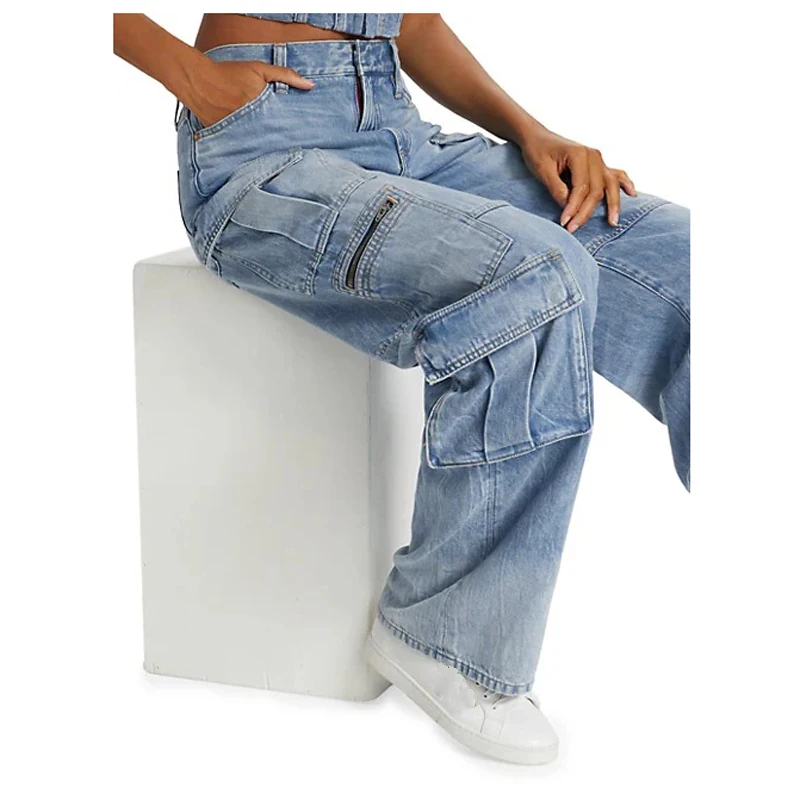 Wholesale Women High Waist Patch Pocket Denim Jeans Zipper Closure Baggy Denim Cargo Pants