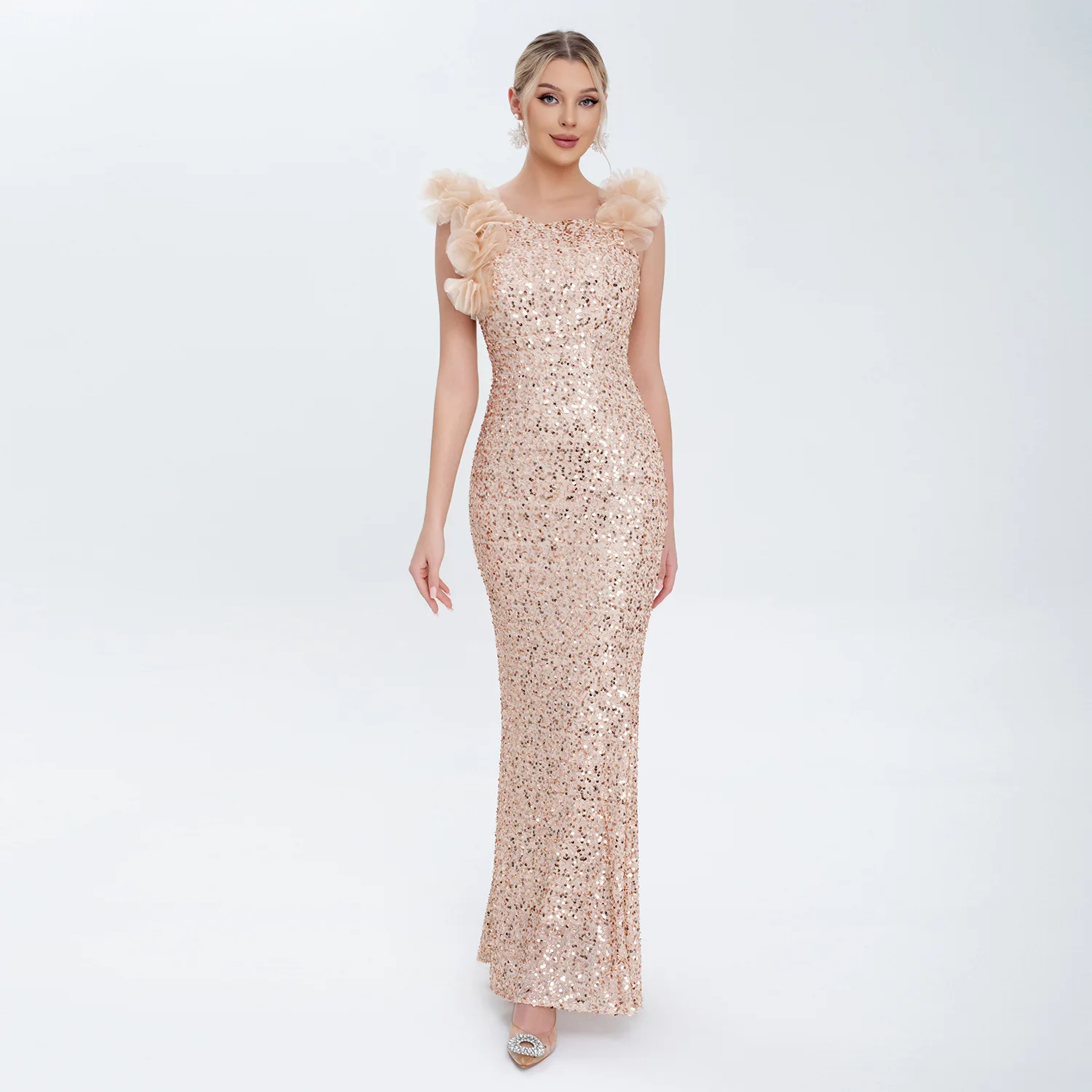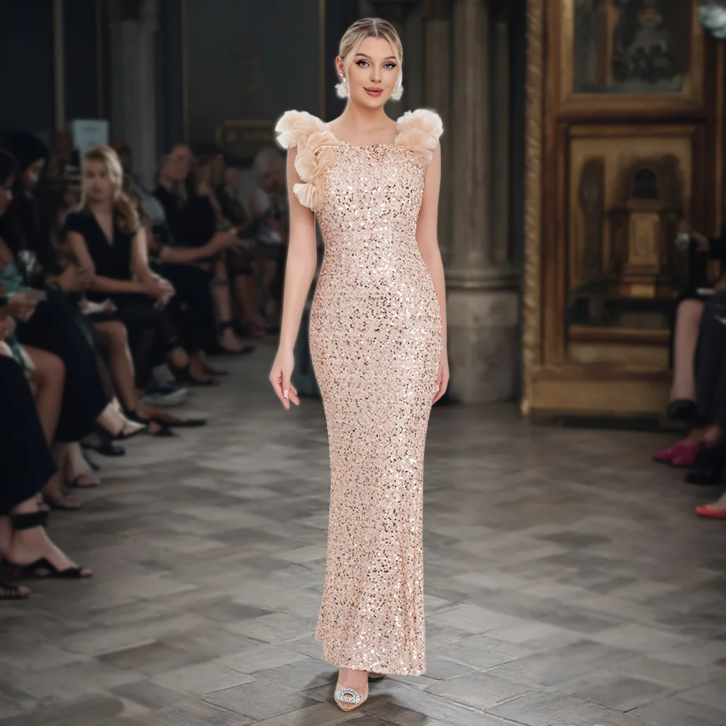 New Women's Clothing: 3D Flower Decorated Luxury Elegant Party Evening Gown with Sequin Corset Dress