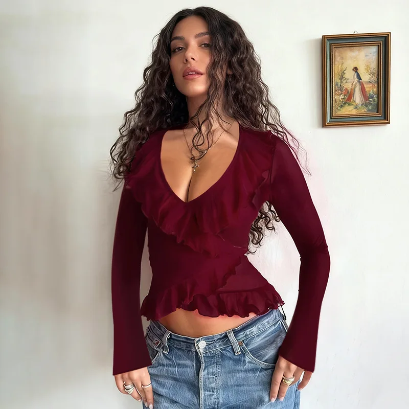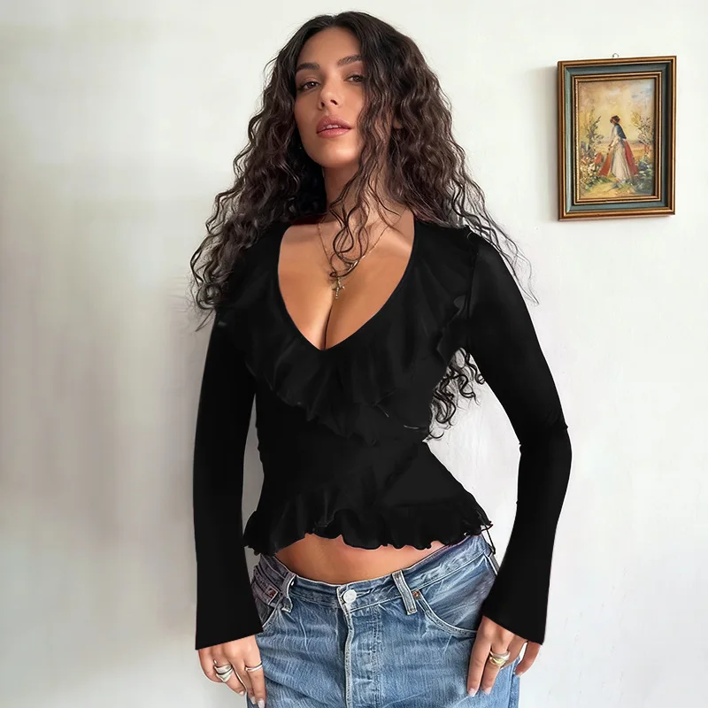 Custom Women's T-shirts New Ruffled Tie-up Long-sleeve Shirts for Women Autumn Leisure All-match T-shirts