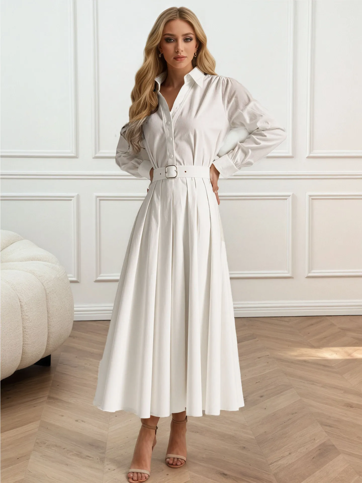 2025 Autumn New Women's Dress Elegant Shirt-style Belted Pleated Long Dress Solid Color Fashion Casual Dress