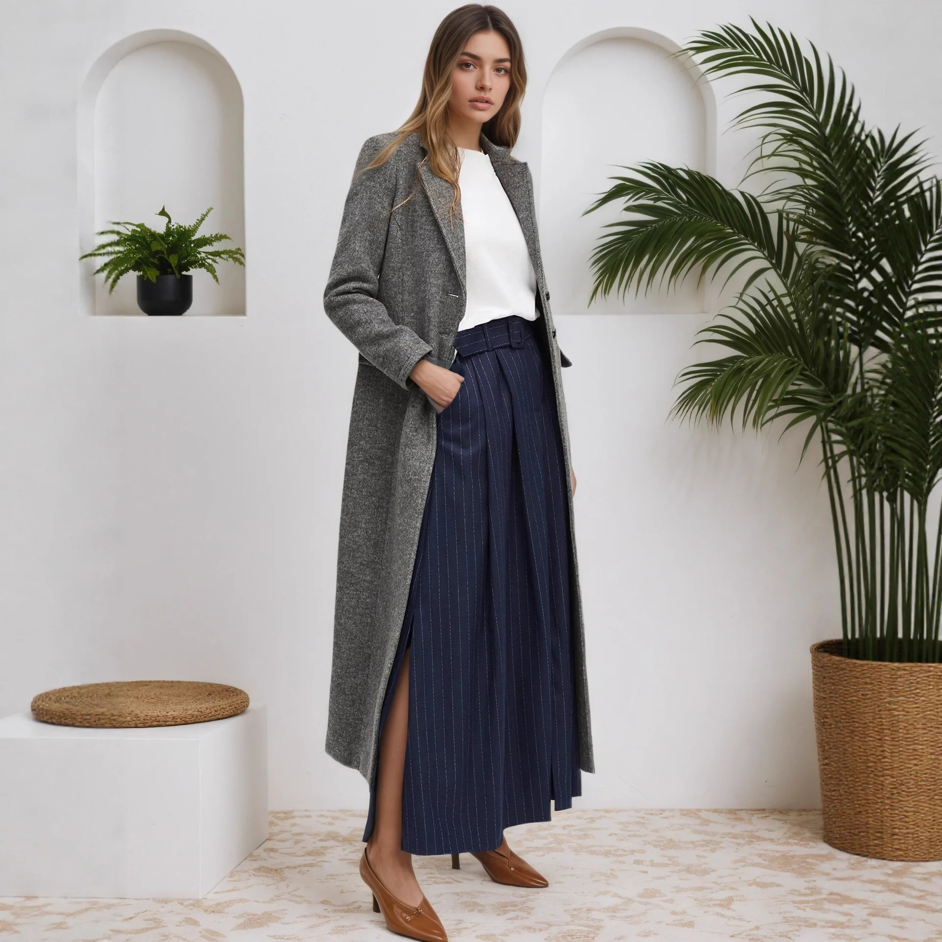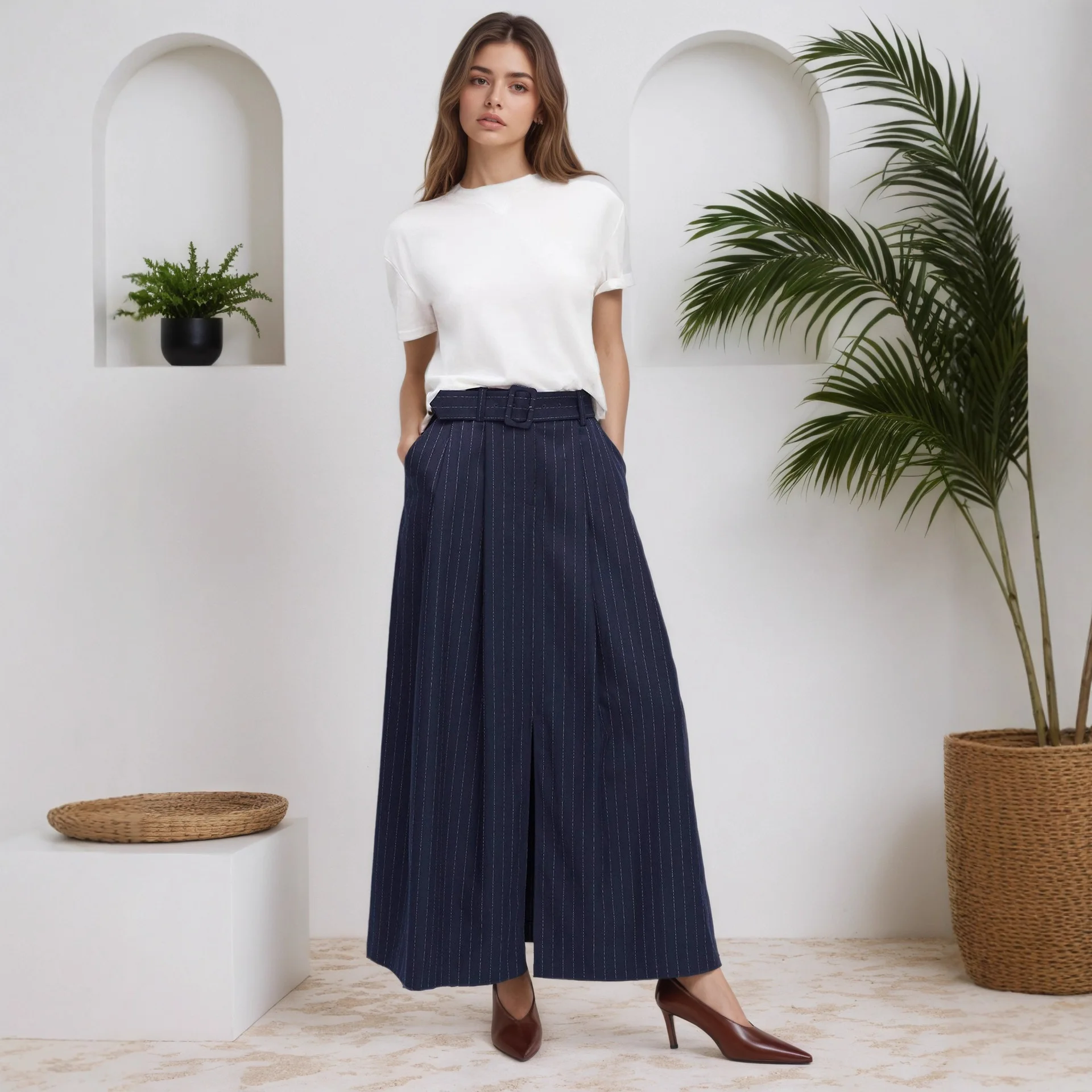 2025 New Women's Fashion High-Waisted Belted Waist-Cinching Slimming Dress, Open Hem Long Striped Versatile Skirt
