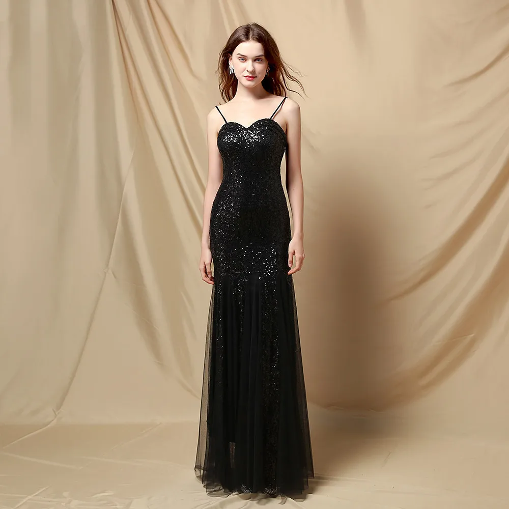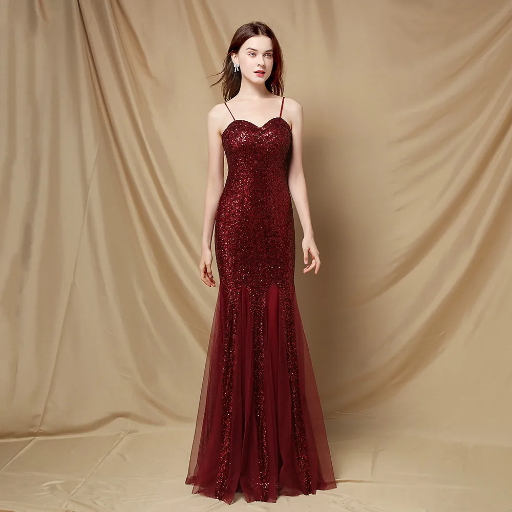New Women's Evening Dress, Elegant Thin Straps, V-neck, Sequined, Long Mermaid Tail, Suitable for Formal Banquets and Parties.