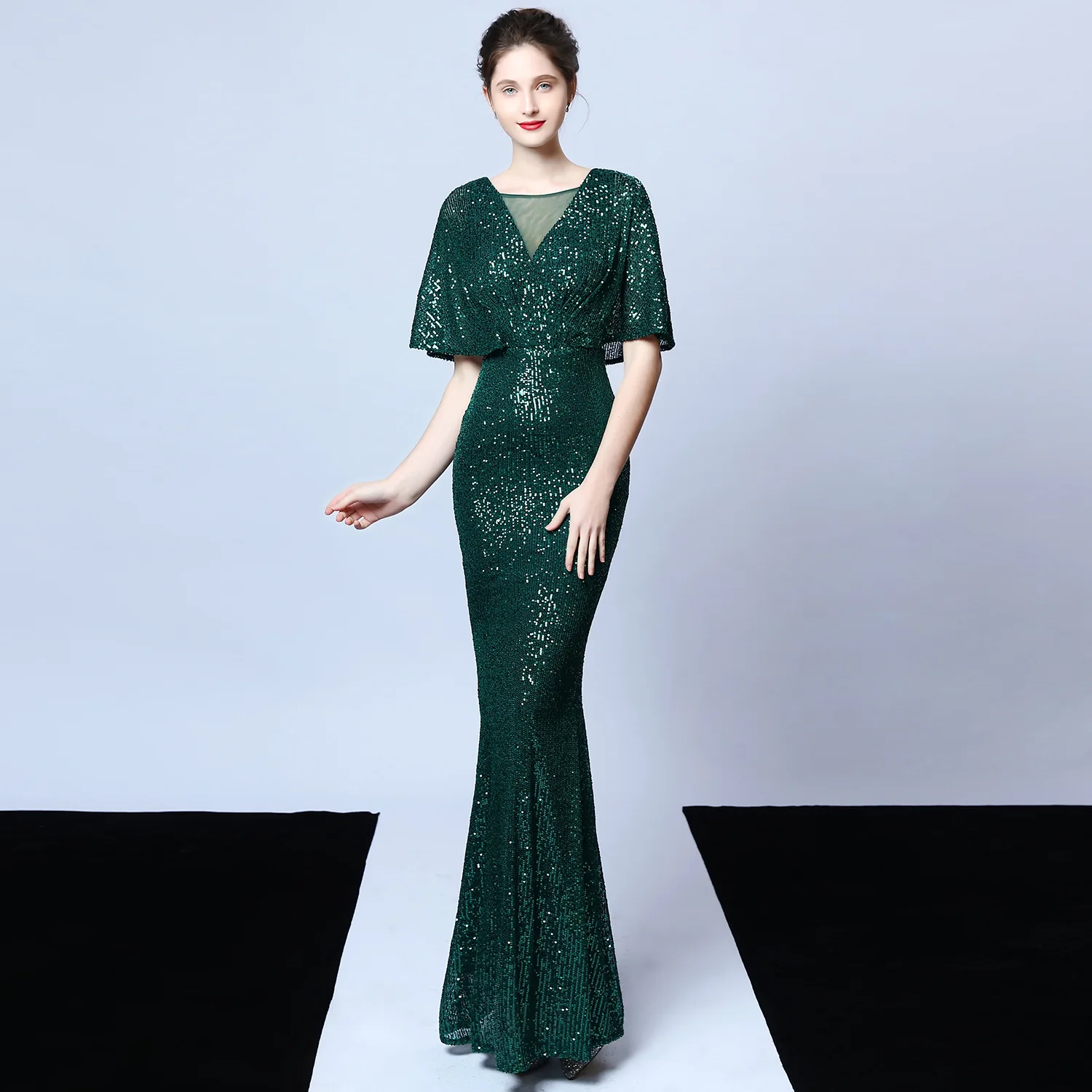New Women's Sequined V-neck Party Dress, Tassel Bead Short Sleeves Mermaid Tail Banquet Elegant and Graceful Evening Gown